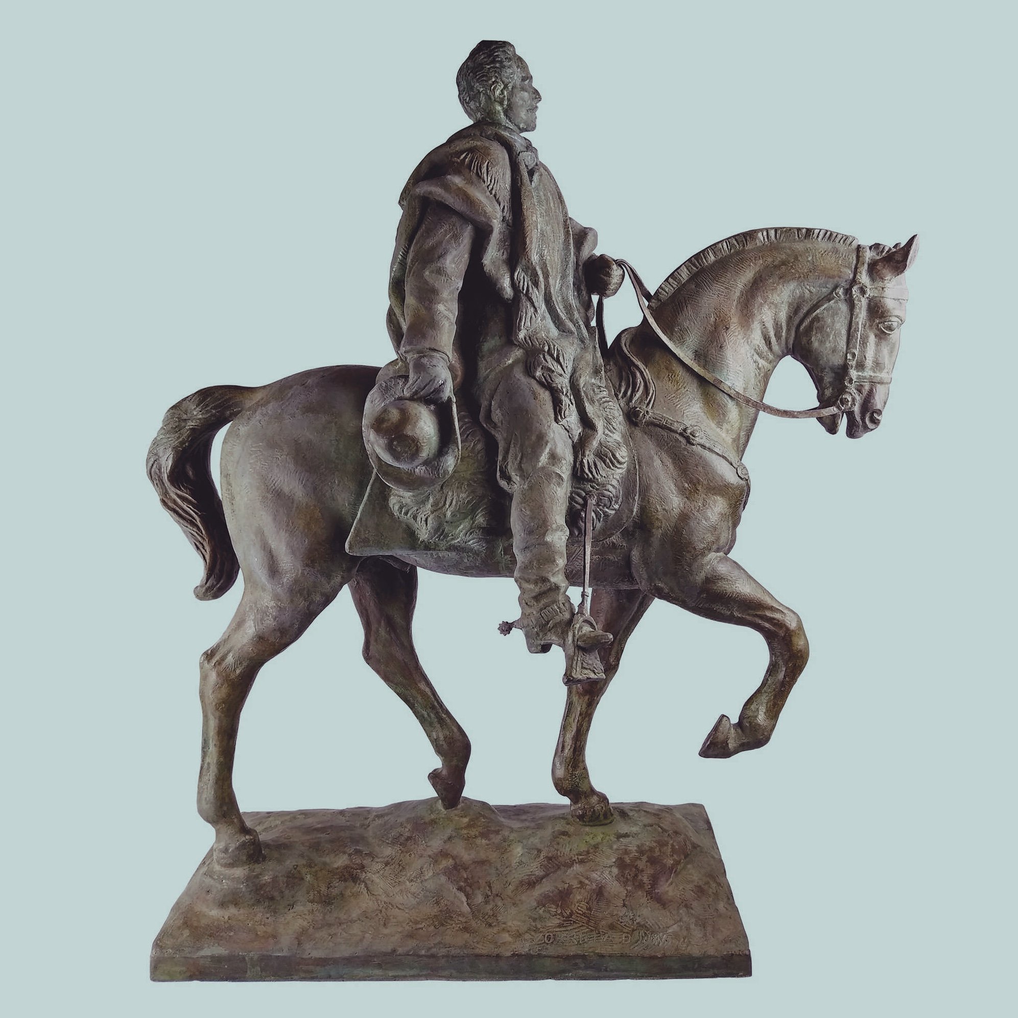 Firmada por el artista y sellada por la prestigiosa fundición Vignali, en su tiempo la elegida en nuestro país para la creación de las obras más destacadas, presentamos hoy una notable versión a escala de esta obra artística, reproducida en las siguientes páginas y exhibida en nuestra casa durante la exhibición para esta subasta. La pátina sugerente del tiempo y la mirada horizontal del caudillo, concretadas en este bronce, manifiestan que aquí, una vez más, la tradición se hace espíritu.