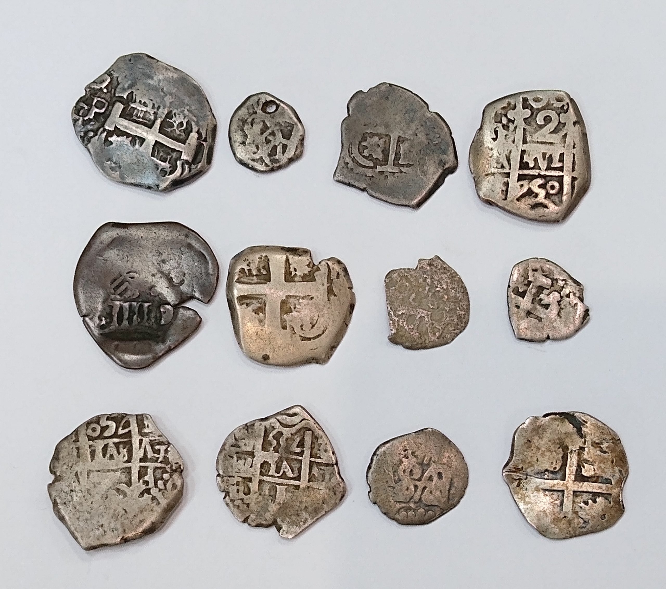 12 monedas macuquinas, 11 en plata y una en cobre.