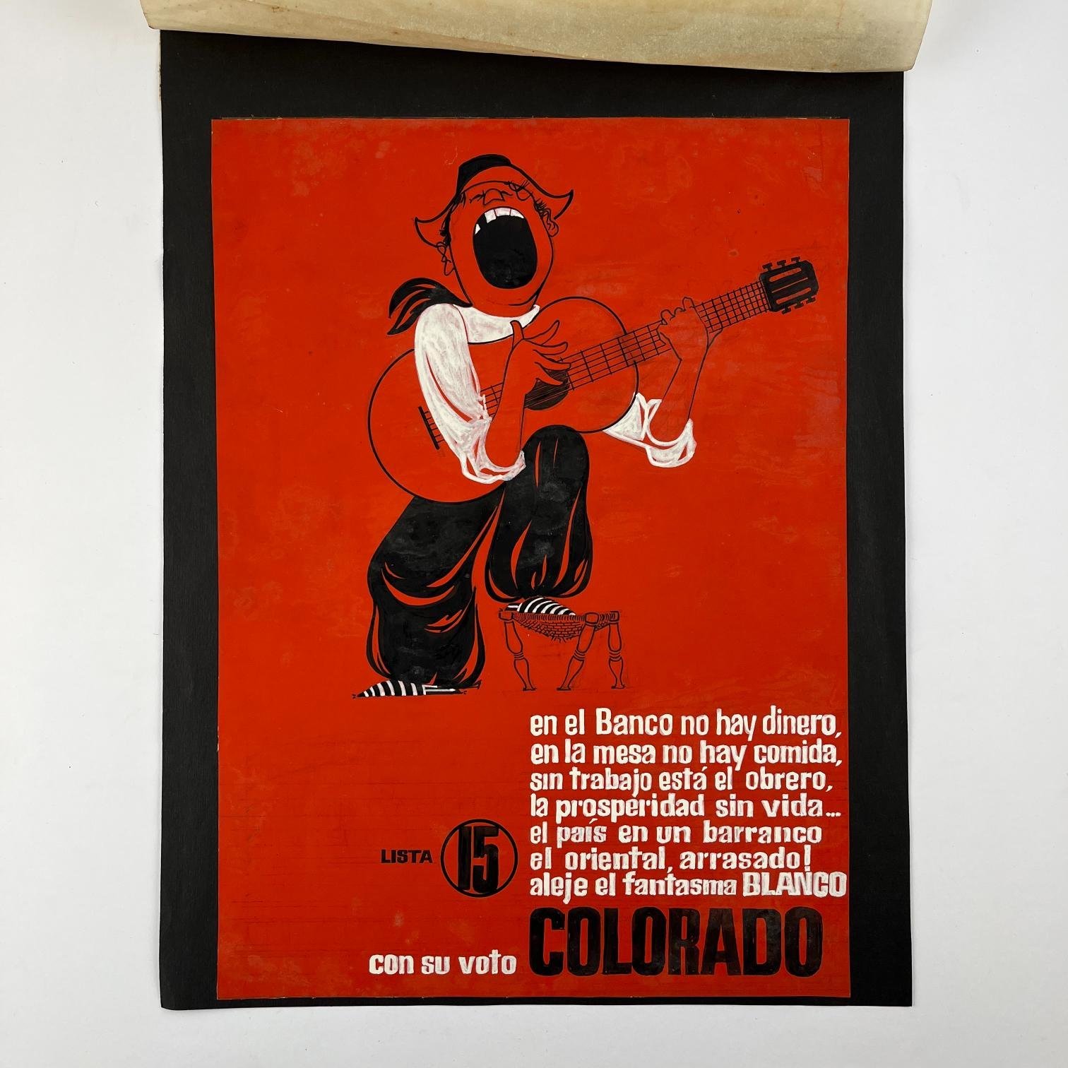 Dos bocetos de afiches electorales pertenecientes a la lista 15 del Partido Colorado, en témpera sobre papel, con dibujos y textos en fondo rojo. 36 x 26 cm y 35 x 25 cm.