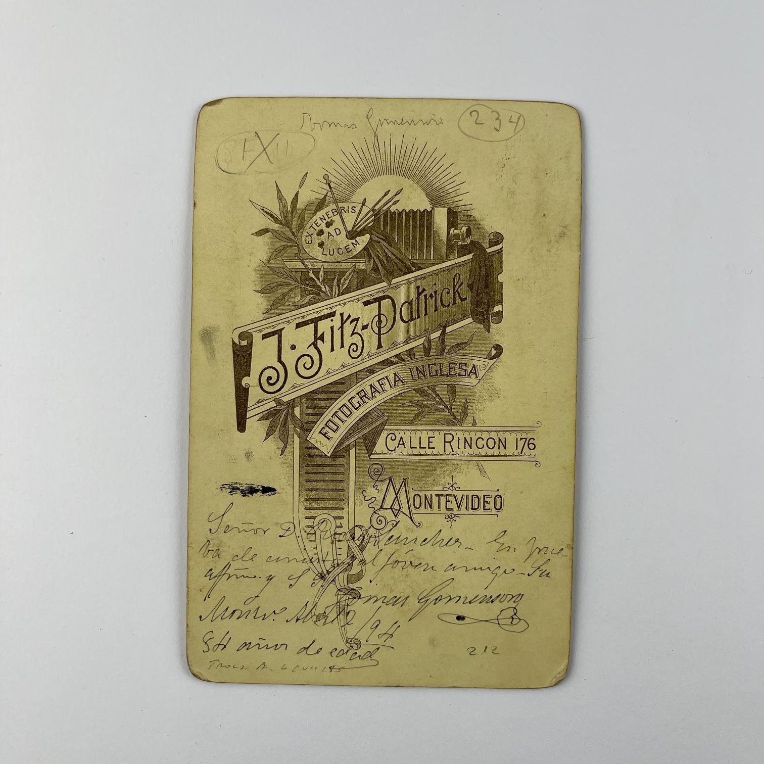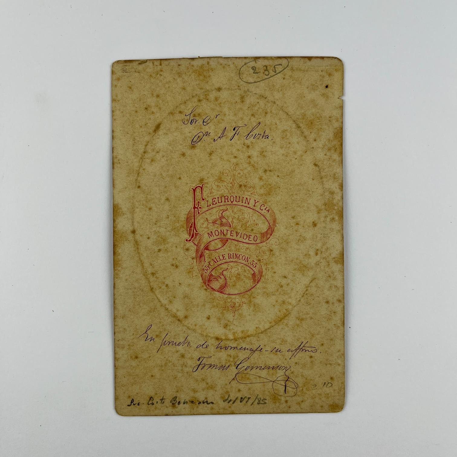Dos fotografías gabinete. «Tomás Gomensoro.» Fitz Patrick y Fleurquin y Cia., Montevideo. Ambas dedicadas y autografiadas por el retratado en el reverso. 16 x 11,5 cm.