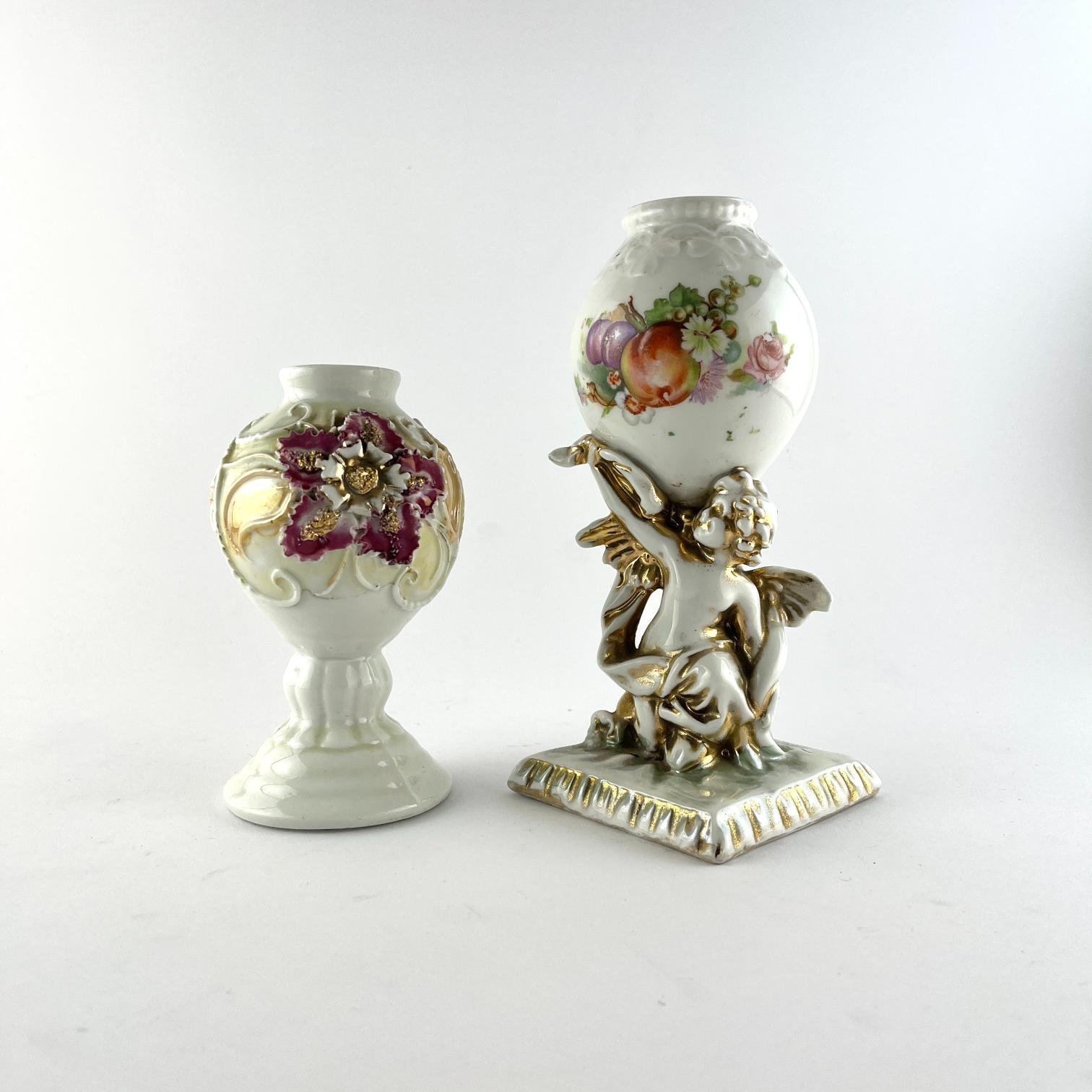 Dos mates en porcelana isabelina con detalles en dorado, decorados «flores» y «frutos», uno con pie esculturado «ángel».