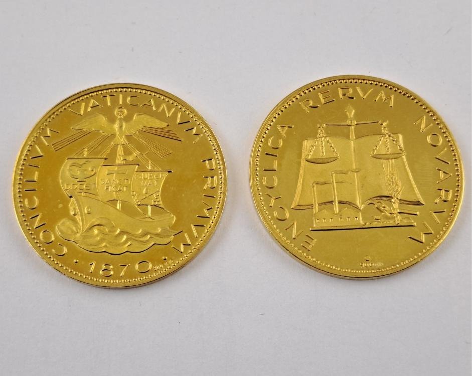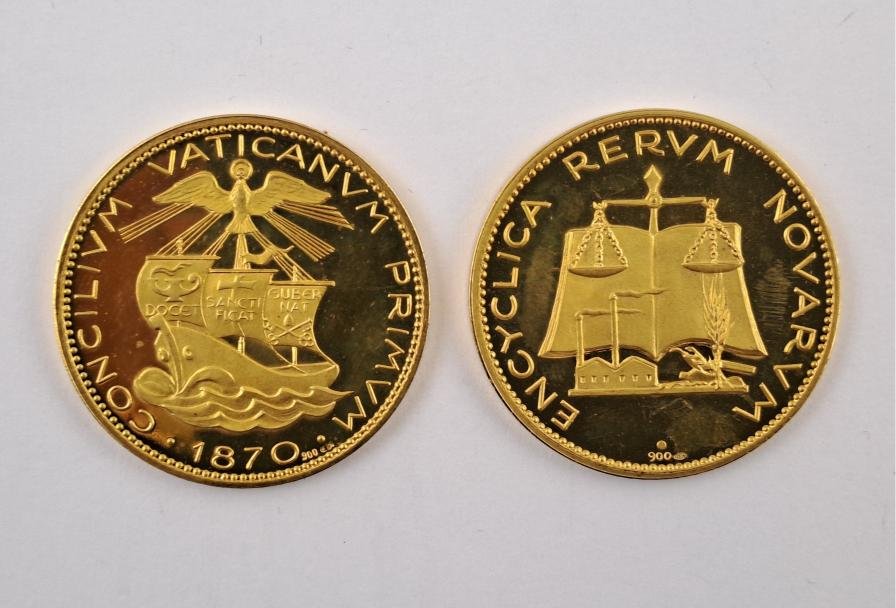 Dos medallas vaticanas en oro 900: una Pío IX (1846-1878) con inscripción “Concilium Vaticanum Primum 1870” y otra León XIIII (1878-1903) con inscripción “Encyclica Rerum Novarum” Peso de cada una: 22 gr aprox.