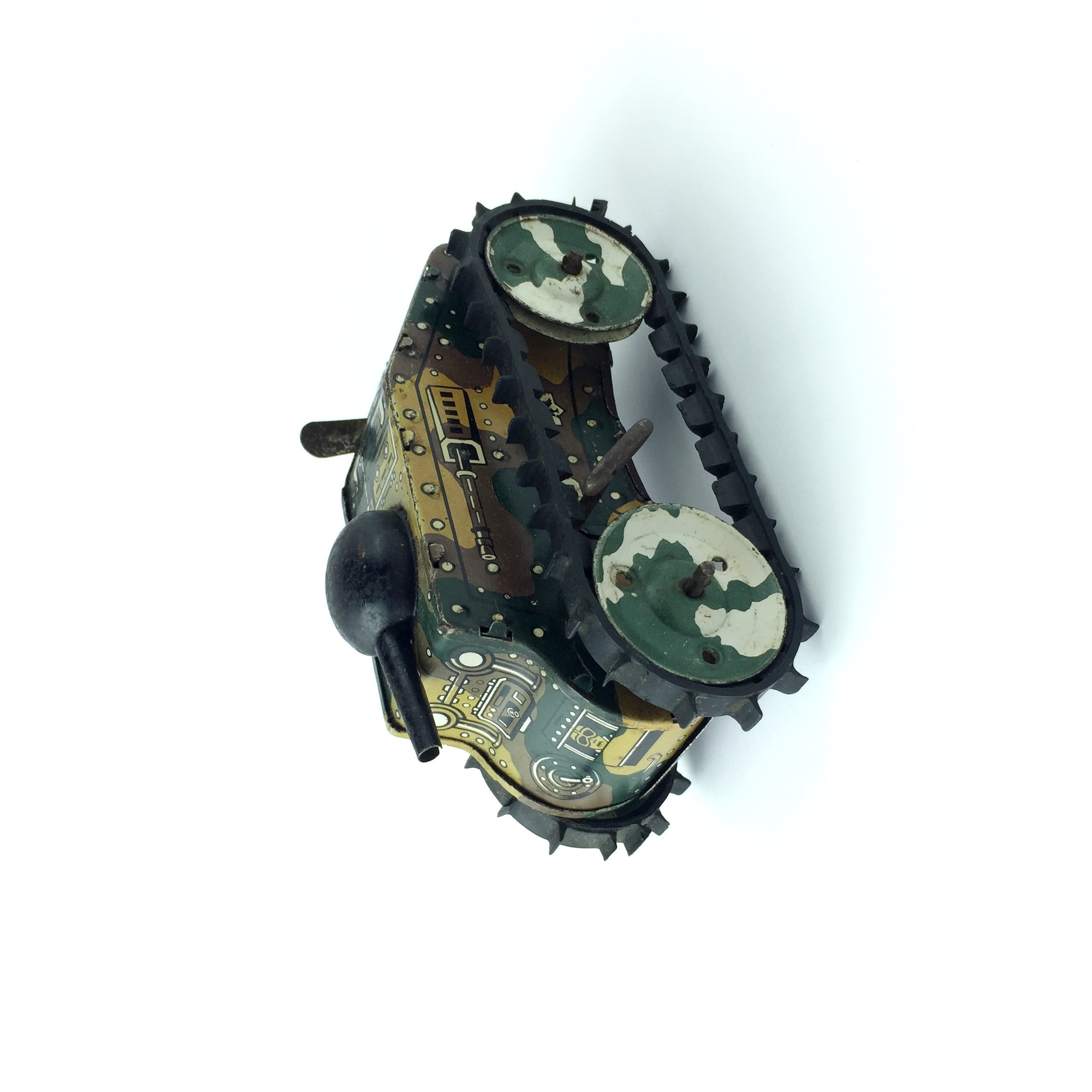 2 vehículos militares en hojalata y goma, 1 jeep willis, Marcas JRD, Francia y 1 tanque Marx de fabricación estadounidense.