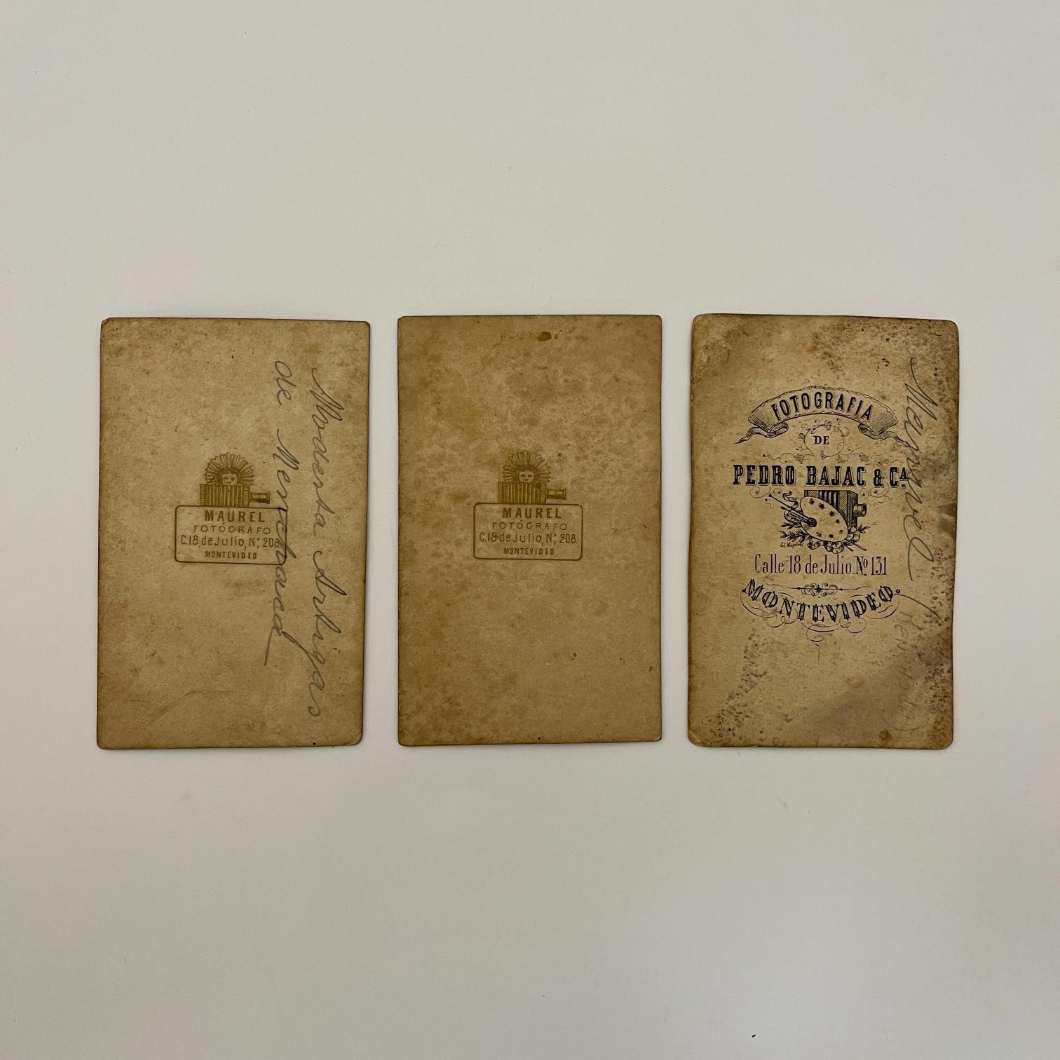Tres carte de visite. «Modesta Cesárea de Menchaca», sobrina de José Gervasio Artigas (dos ejemplares). Maurel, Montevideo, y «Manuel Menchaca». Pedro Bajac, Montevideo.