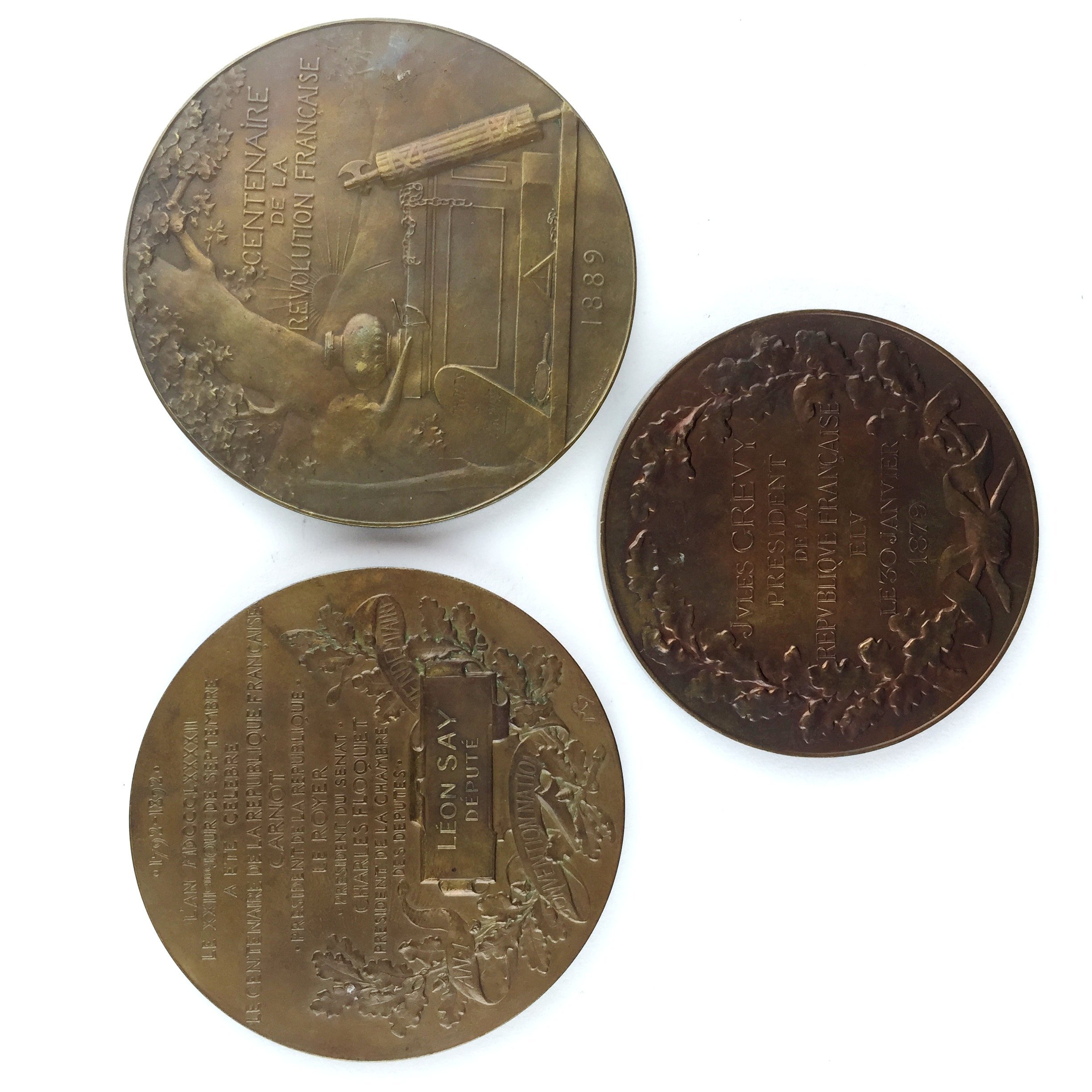 3 medallas francesas en bronce. «Republique Francaise 1972-1892», «Centenaire de la Revolution Francaise 1889», «Jules Grevy». Diámetros 7 cm.