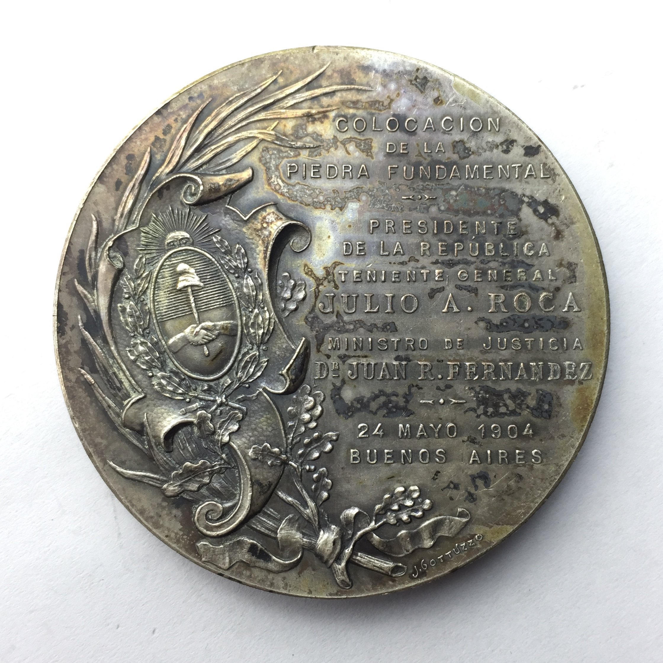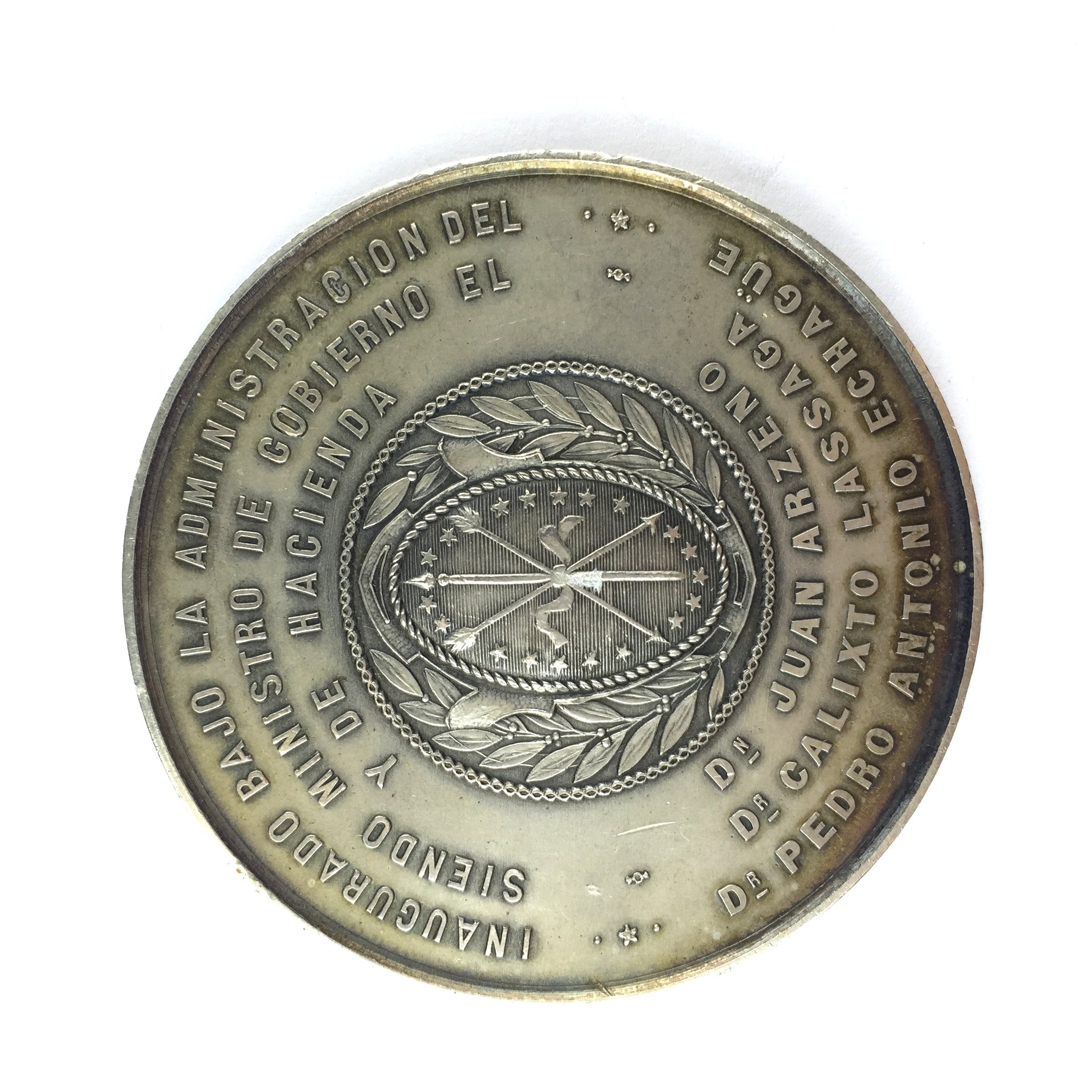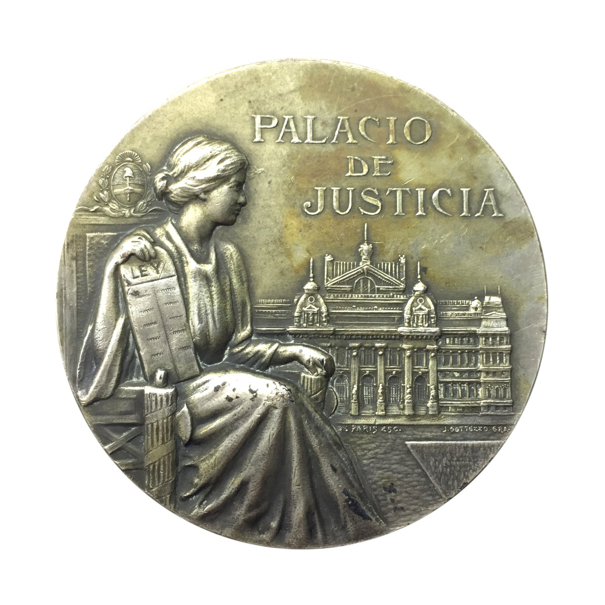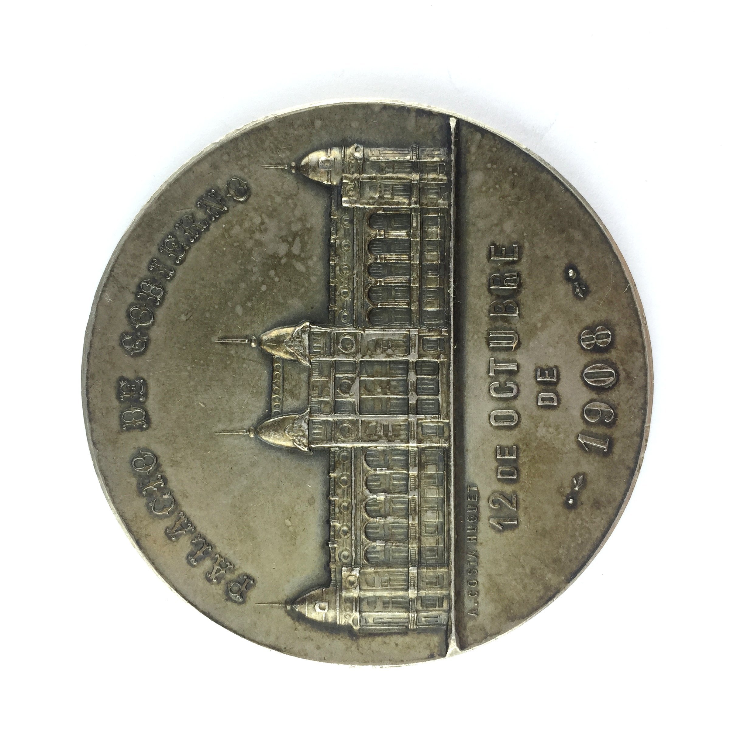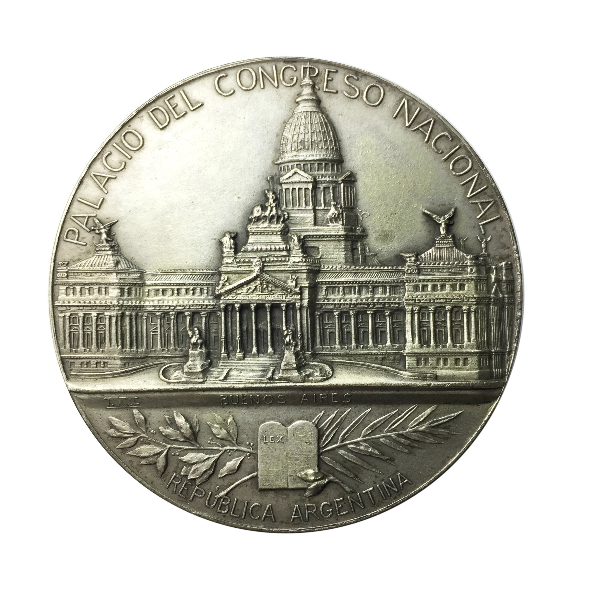 3 medallas argentinas en plata. «Palacio de Gobierno 1908.» «Palacio del Congreso Nacional 1904.» «Palacio de Justicia 1904.» Diámetros 6.5, 7 y 6.5 cm.