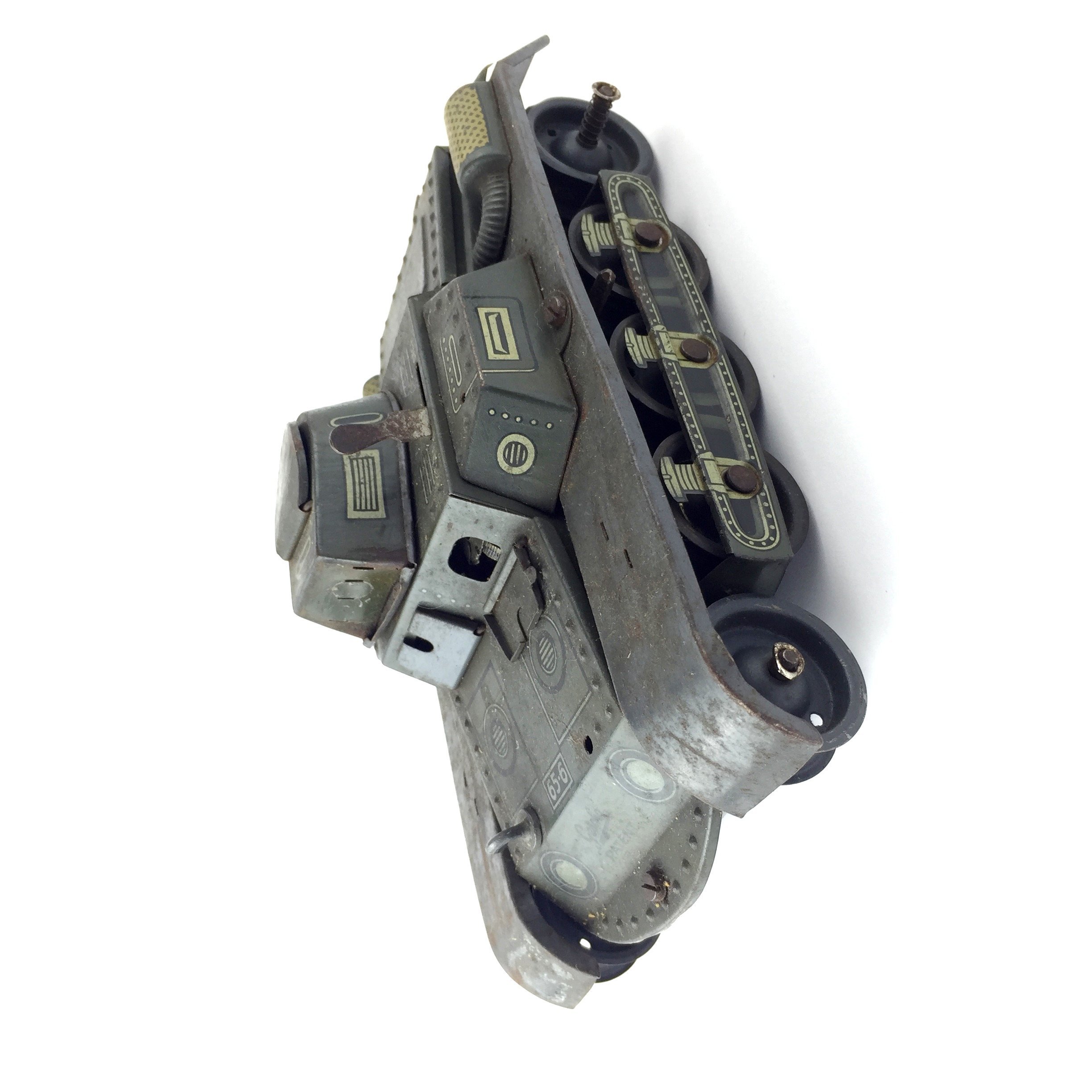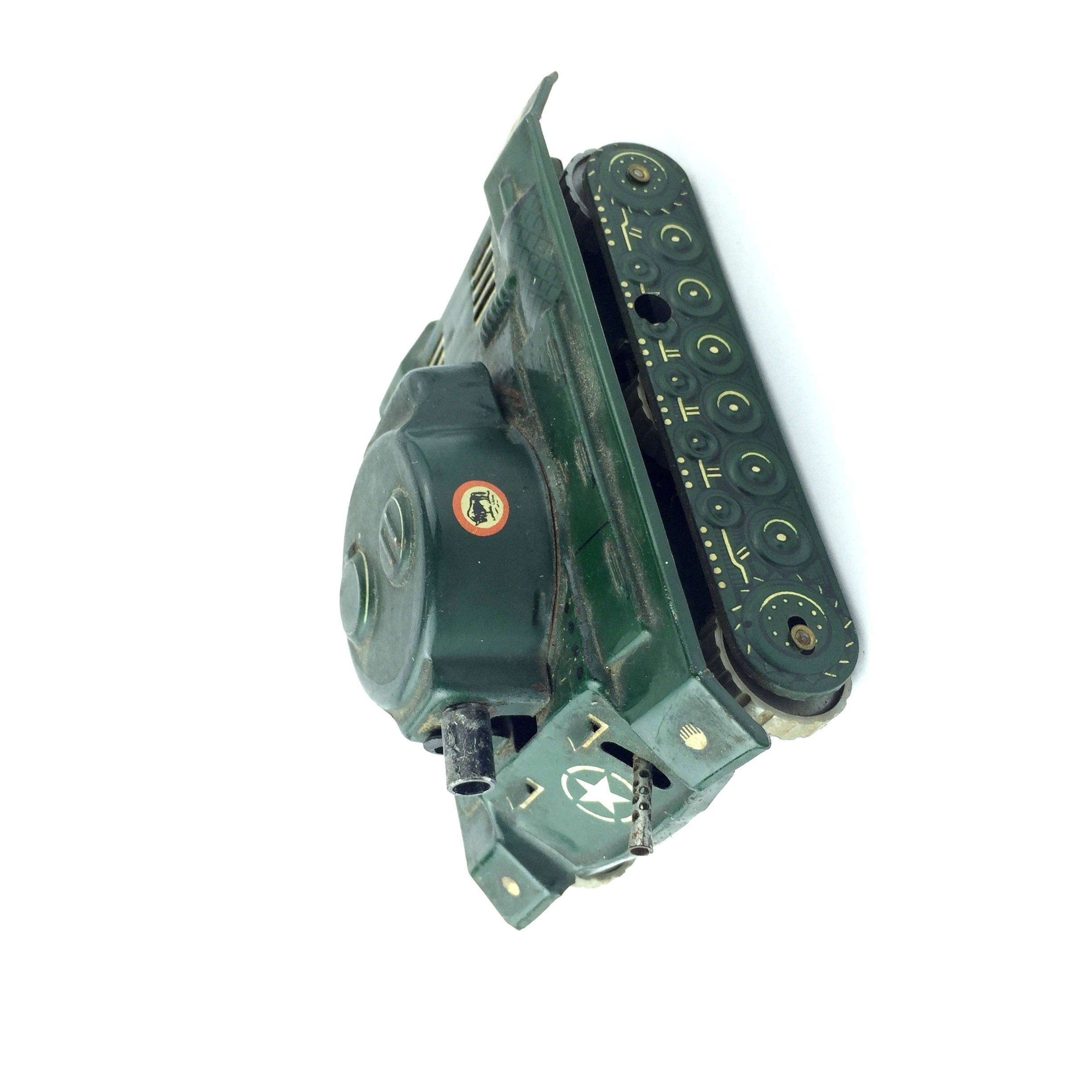 2 tanques en hojalata modelo Panzer, marca Gesha. Junto con 1 tanque de hojalata modelo 65-5-M Panzer marca Gesha. En caja original, averiada.