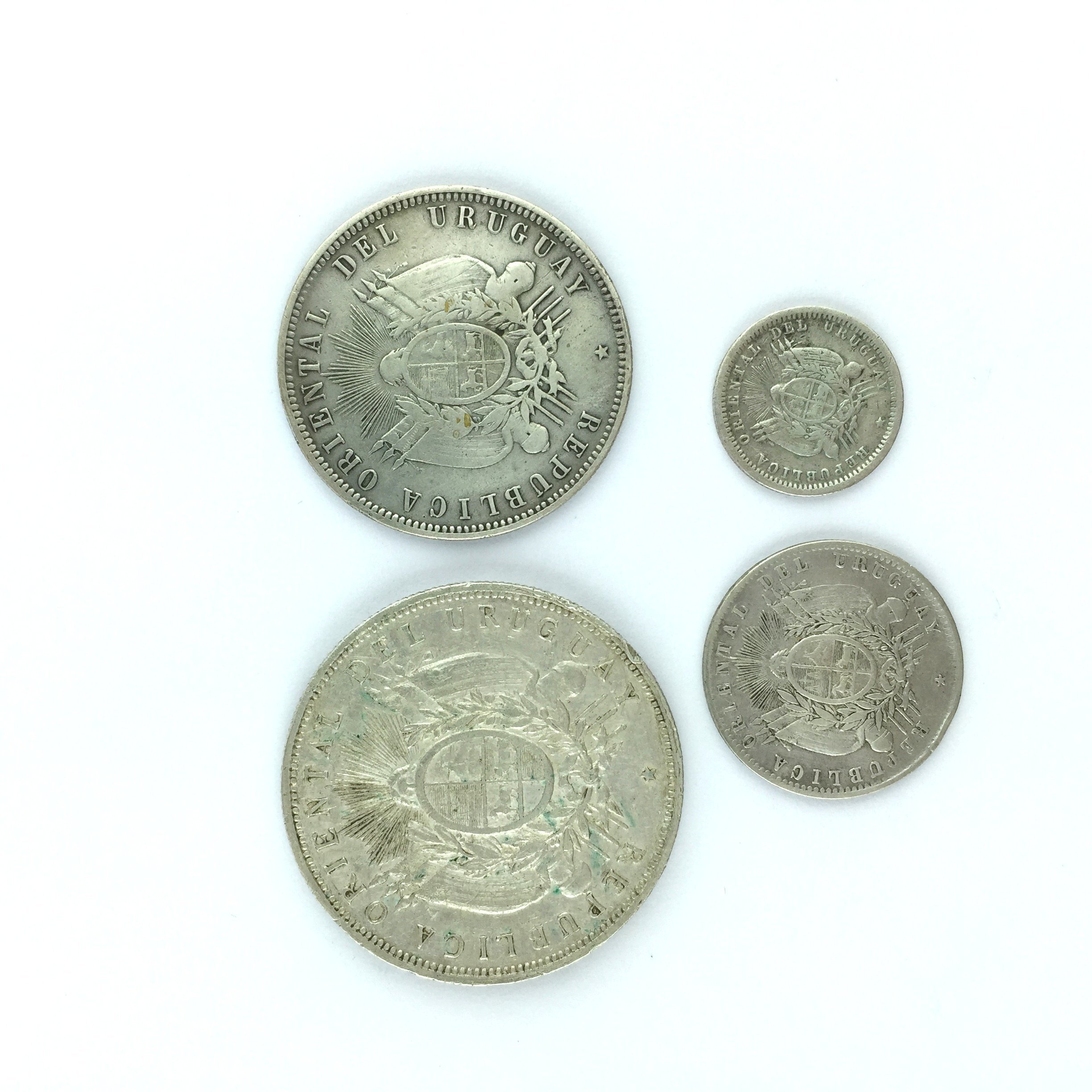 4 monedas uruguayas en plata año 1893 denominación 1 peso, 50, 20 y 10 centésimos.