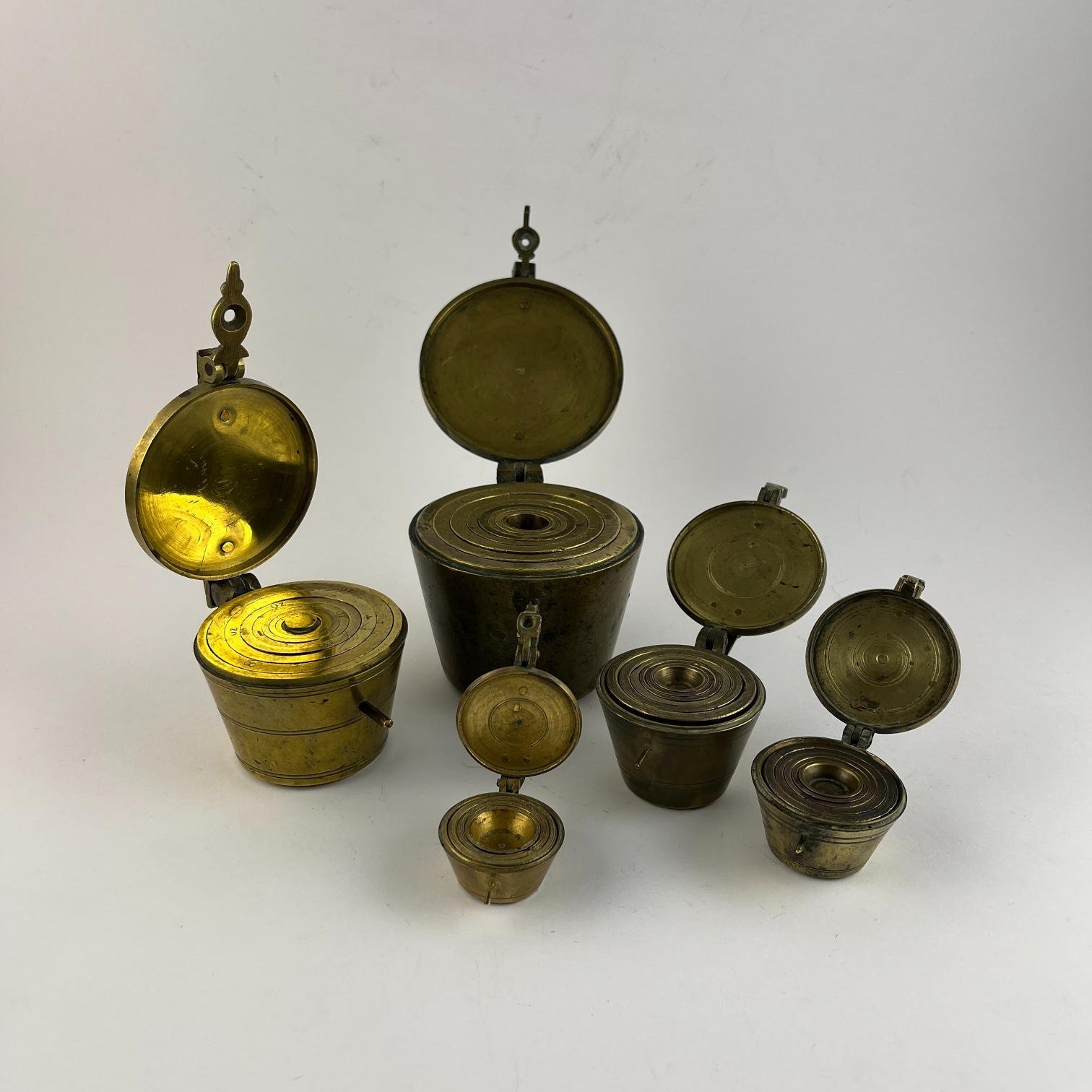 Cinco ponderales de vasos anidados, en bronce. Alto máximo 7 cm.