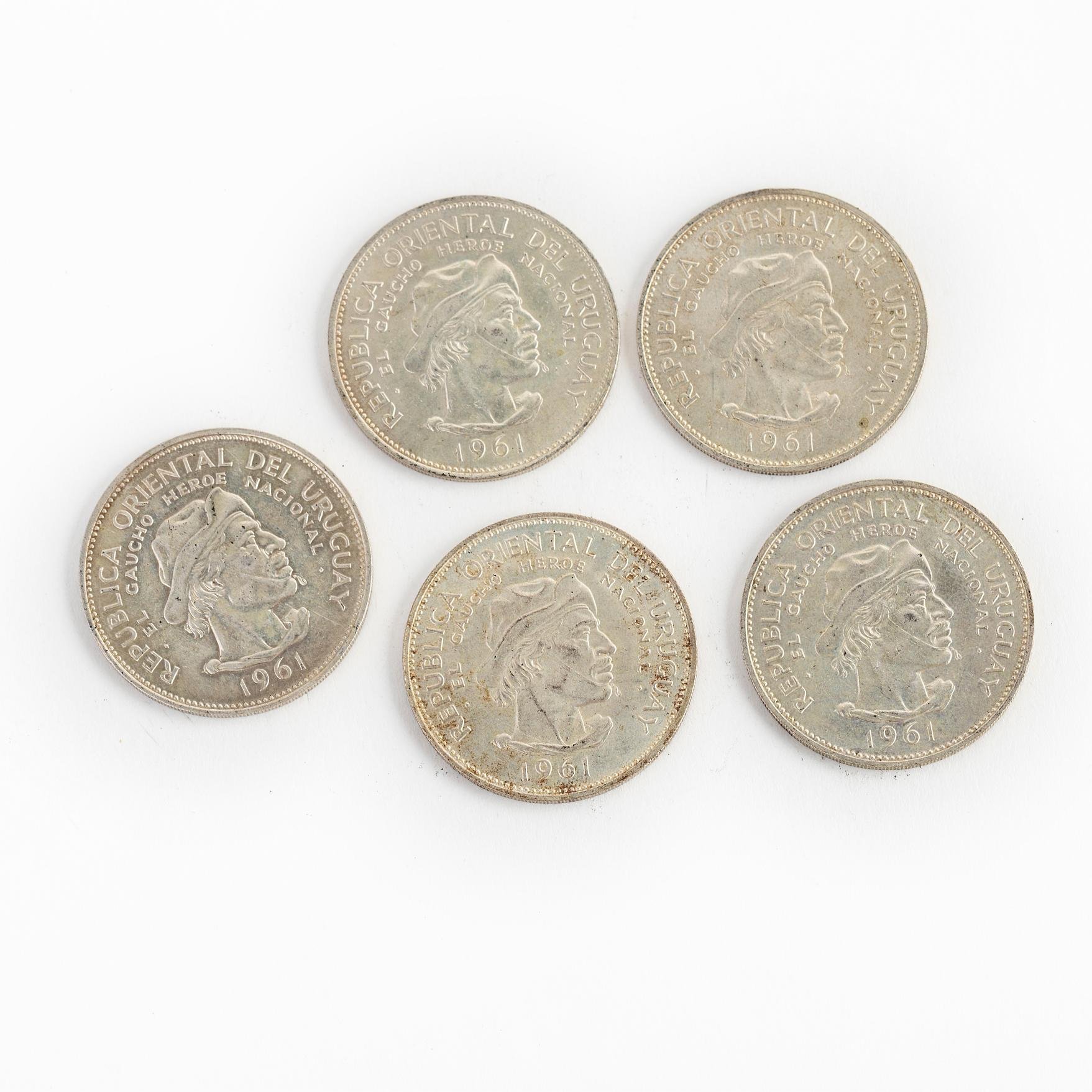 Conjunto de cinco monedas uruguayas en plata denominación 10 pesos del año 1961. “Gauchos.”