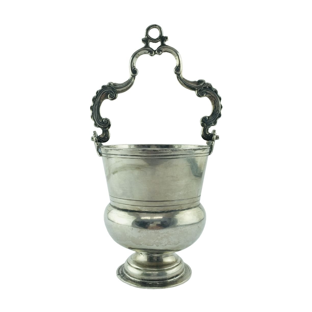 Acetre hispanoamericano s. XVIII en plata lisa con arco cincelado «valvas». 25 x 10.5 cm. Peso 850 gr.