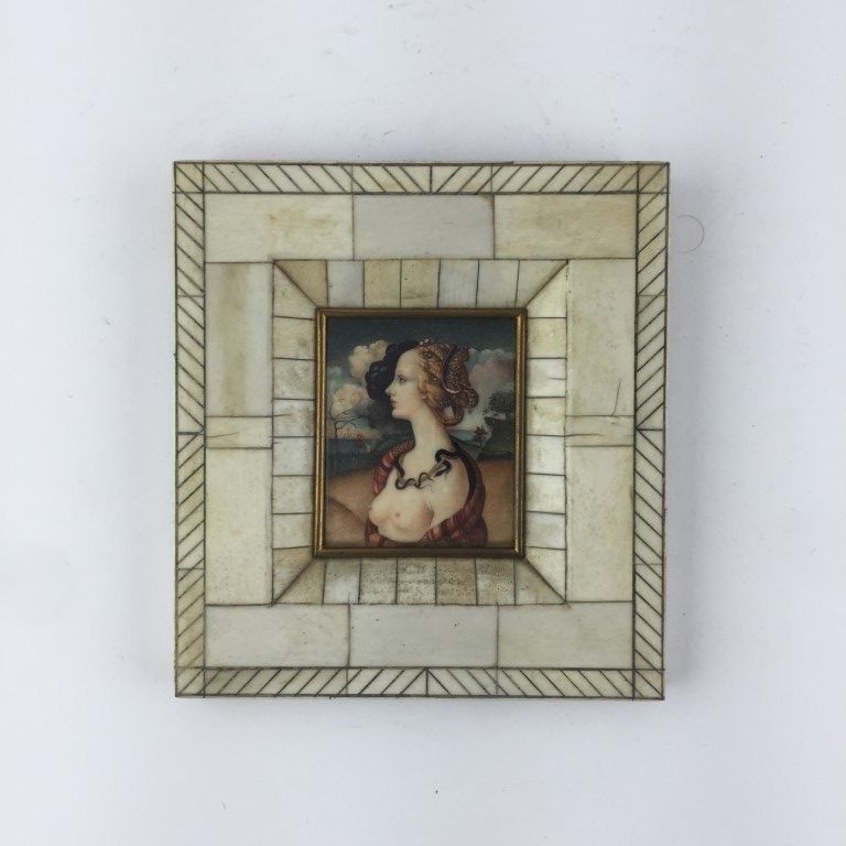 Miniatura rectangular. Acuarela sobre celuloide. «Simonetta Vespuci como Cleopatra.» 7 x 6 cm. Marco en placas de marfil. 16 x 15 cm.