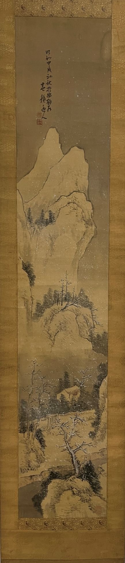 Acuarela japonesa sobre rollo de seda. «Paisaje.» Firmado y sellado arriba a la izquierda. Medidas acuarela 118 x 20.5 cm. Largo total 187 cm.