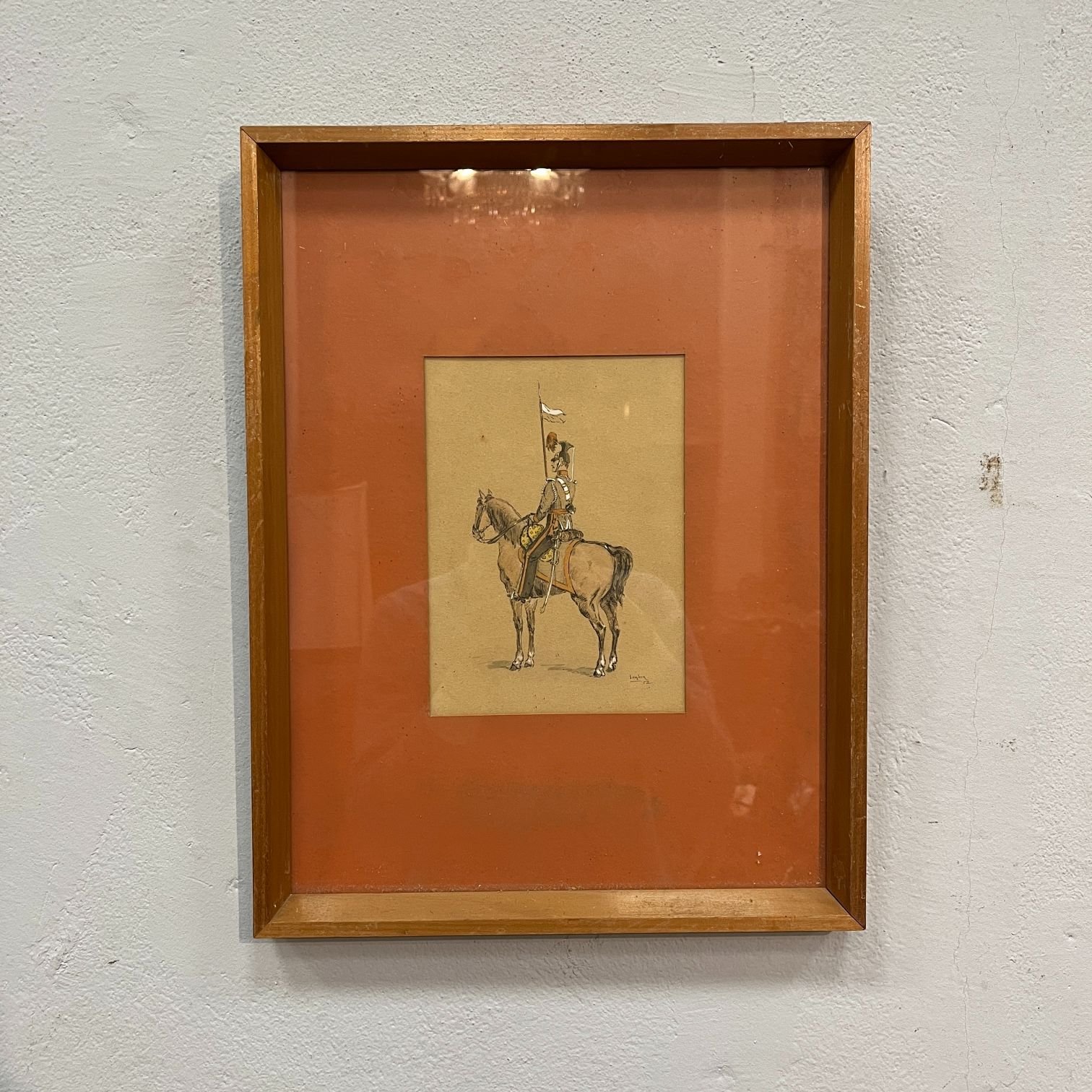 Par de acuarelas y tintas sobre papel. «Lancero voluntario de la constitución de 1839», firmado y fechado «52» abajo a la derecha, y «Oficial de dragones de fines del siglo XVIII», firmados “Sanson” abajo a la derecha. 20 x 14.5 cm.