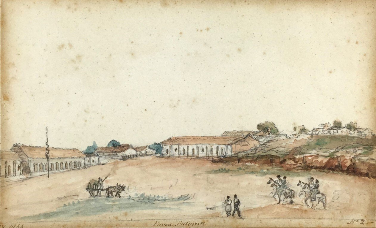 Par de acuarelas iconográficas paraguayas del siglo XIX, autor no identificado, firmadas «F.V.» y fechadas «1854». «Plaza Antigua (Asunción)», numerada «1», y «Plaza Antigua», numerada «2». 11.5 x 17 cm y 10.5 x 17 cm.
