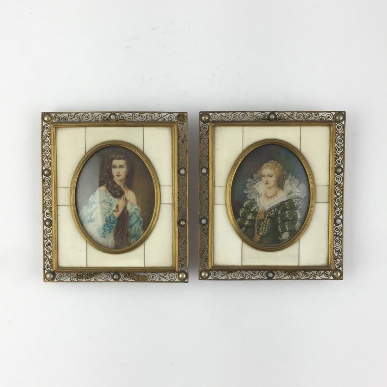 Par de miniaturas ovales. Acuarela sobre celuloide. «Barbara Rimsky-Korsakov» y «Dama del siglo XVI». 8.5 X 6.5 cm. Marcos en placas de marfil y bronce.
