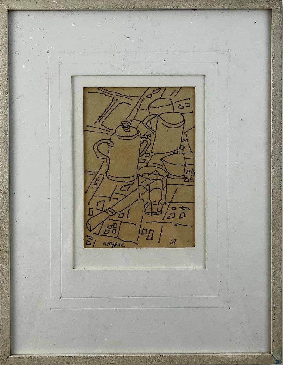 ADOLFO NIGRO (Escuela uruguaya, 1942-2018) Tinta sobre papel «Bodegón» Firmado abajo a la izquierda Fechado «67» abajo a la derecha 15 x 11 cm