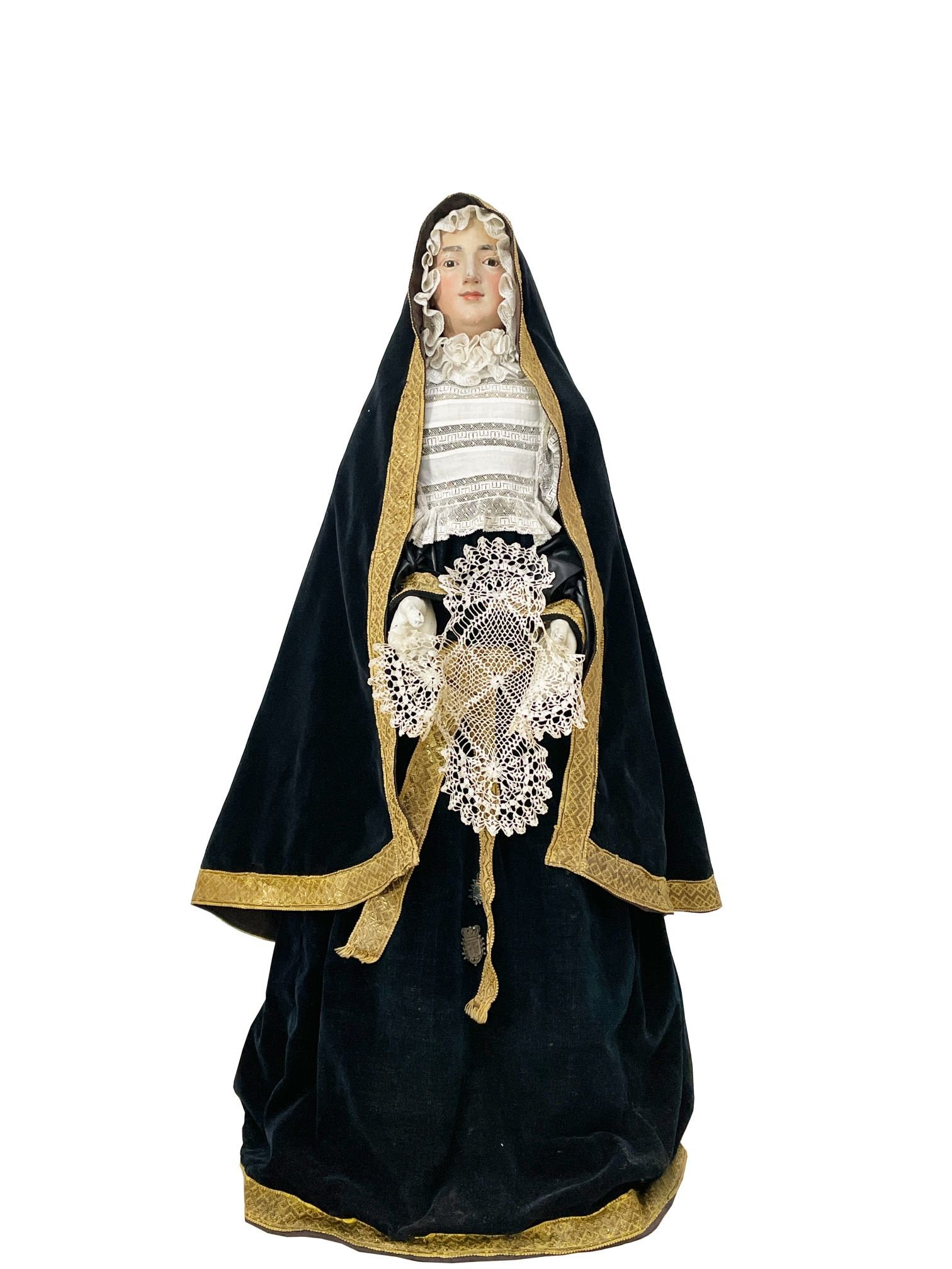 Santo de vestir europeo, s. XIX. «Santa Teresita del Niño de Jesús.» Estructura en madera, con rostro y cabeza en madera policromada sobre estuco. Alto 80 cm. Presentada en oratorio de madera con una puerta y laterales en cristal, de 95 x 49 x 38 cm.