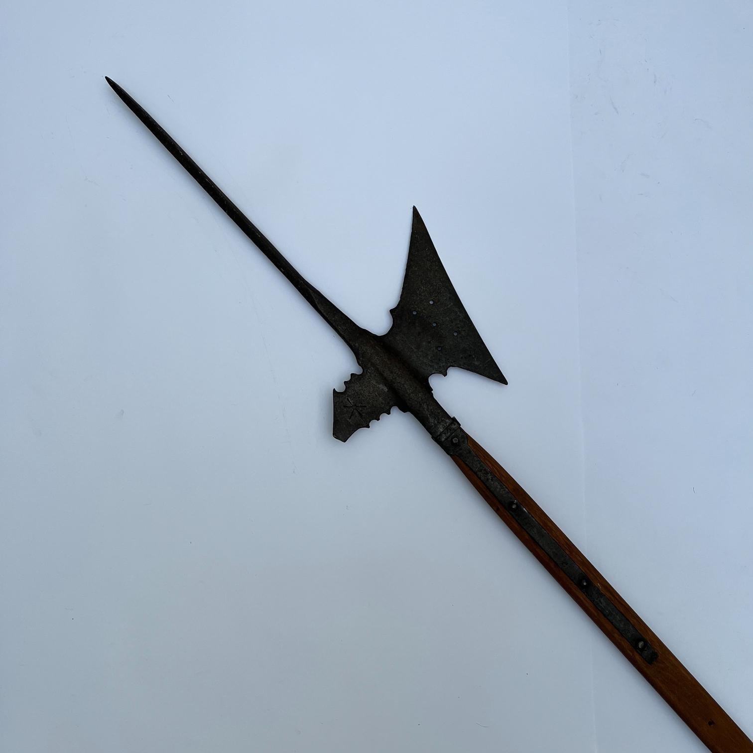 Alabarda en hierro forjado y calado con costillas con cuatro remaches cada una y asta en madera, no original. Alto 135 cm.