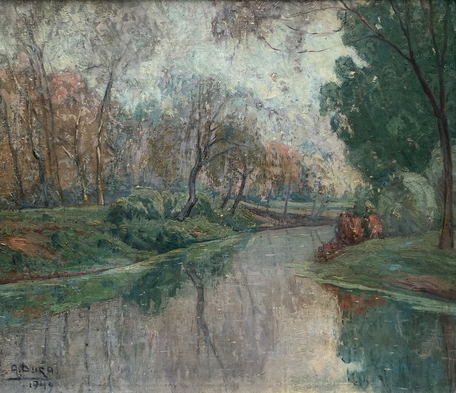 ALBERTO DURA (1888-1971) Óleo sobre cartón «Paisaje del arroyo Miguelete» Firmado y fechado «1949» abajo a la izquierda 40 x 48 cm