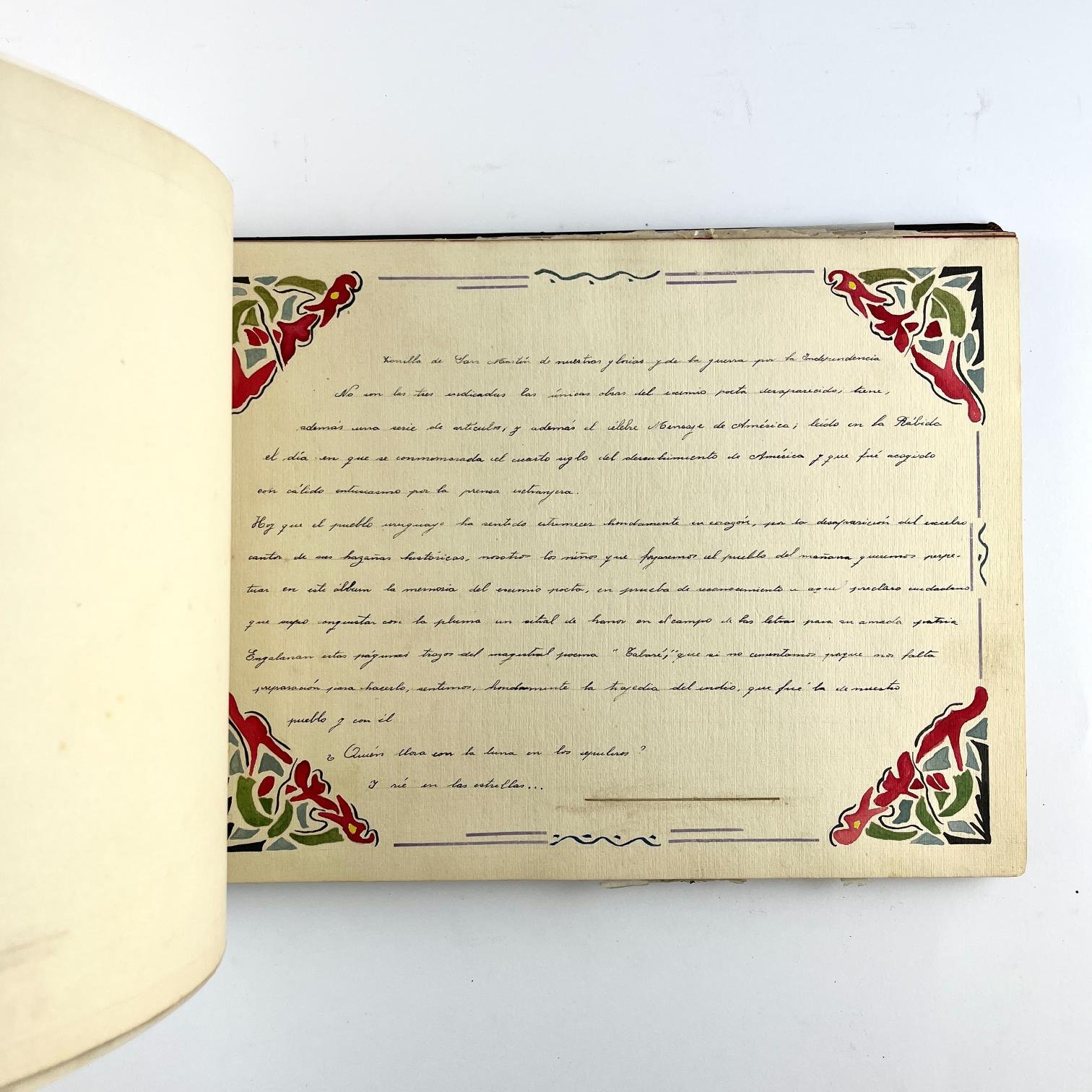 Álbum «Homenaje a J. Zorrilla de San Martín» realizado por la Escuela No. 43 en noviembre de 1931 tras el fallecimiento del escritor, conteniendo diversas fotografías y documentos en memoria al «Poeta de la Patria». Encuadernado en cuero.