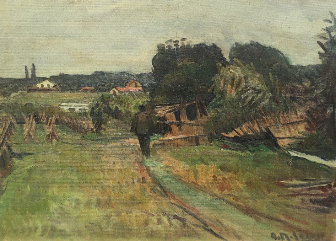 RIBEIRO, Alceu (escuela uruguaya, 1919-2013). Óleo sobre tela. «Paisaje de campo.» Firmado abajo a la derecha. 56 x 66 cm.