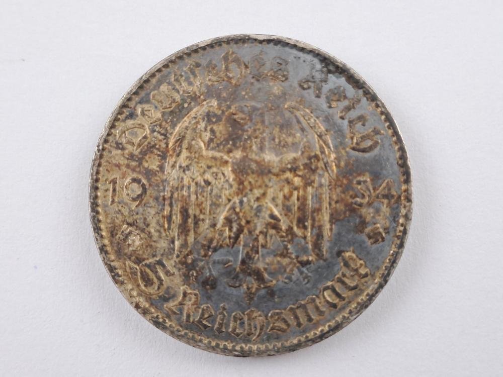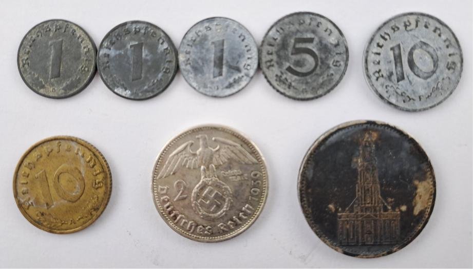 Ocho monedas de la Alemania Nacionalsocialista: 5 reichmarks del año 1934 F (en plata 900, de un peso de 13,88 gr aprox.); 2 reichmarks del año 1939 A (en plata 625, de un peso de 8 gr aprox.); 10 reichpfennig de los años 1937 A y 1943 F; 5 reichpfennig del año 1943 G; 1 reichpfennig de los años 1940 D, 1941 F y 1944 G.
