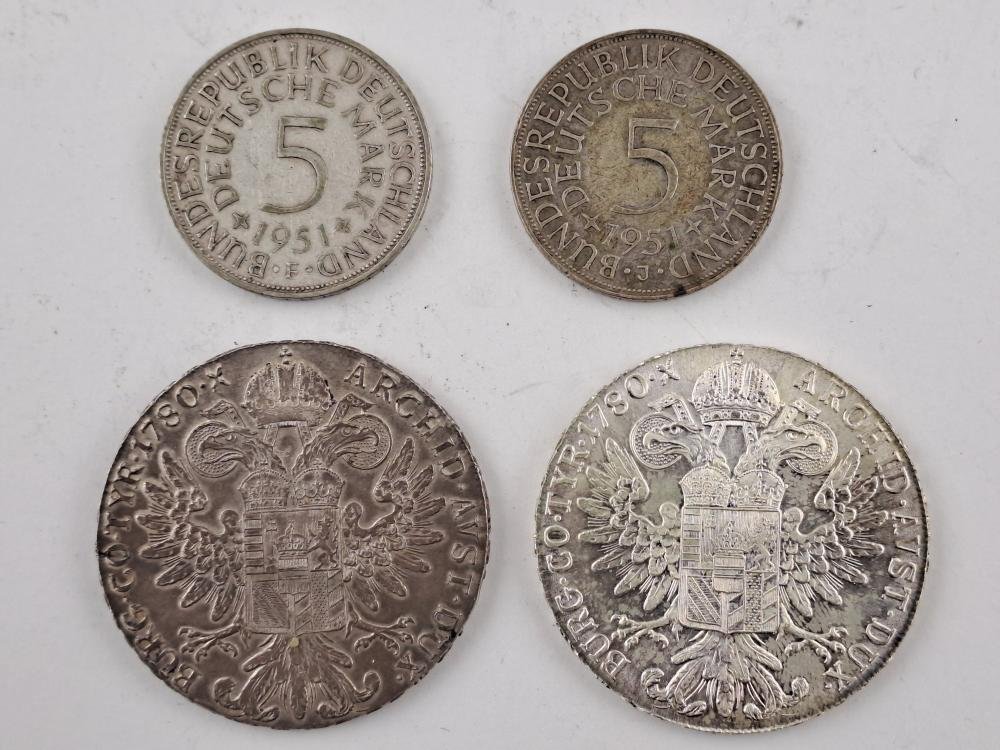 Cuatro monedas en plata: dos alemanas en plata 625 denominaciones 5 marcos del año 1951 (ceca J y F) y dos austríacas época María Teresa en plata denominaciones 1 tálero del año 1780.