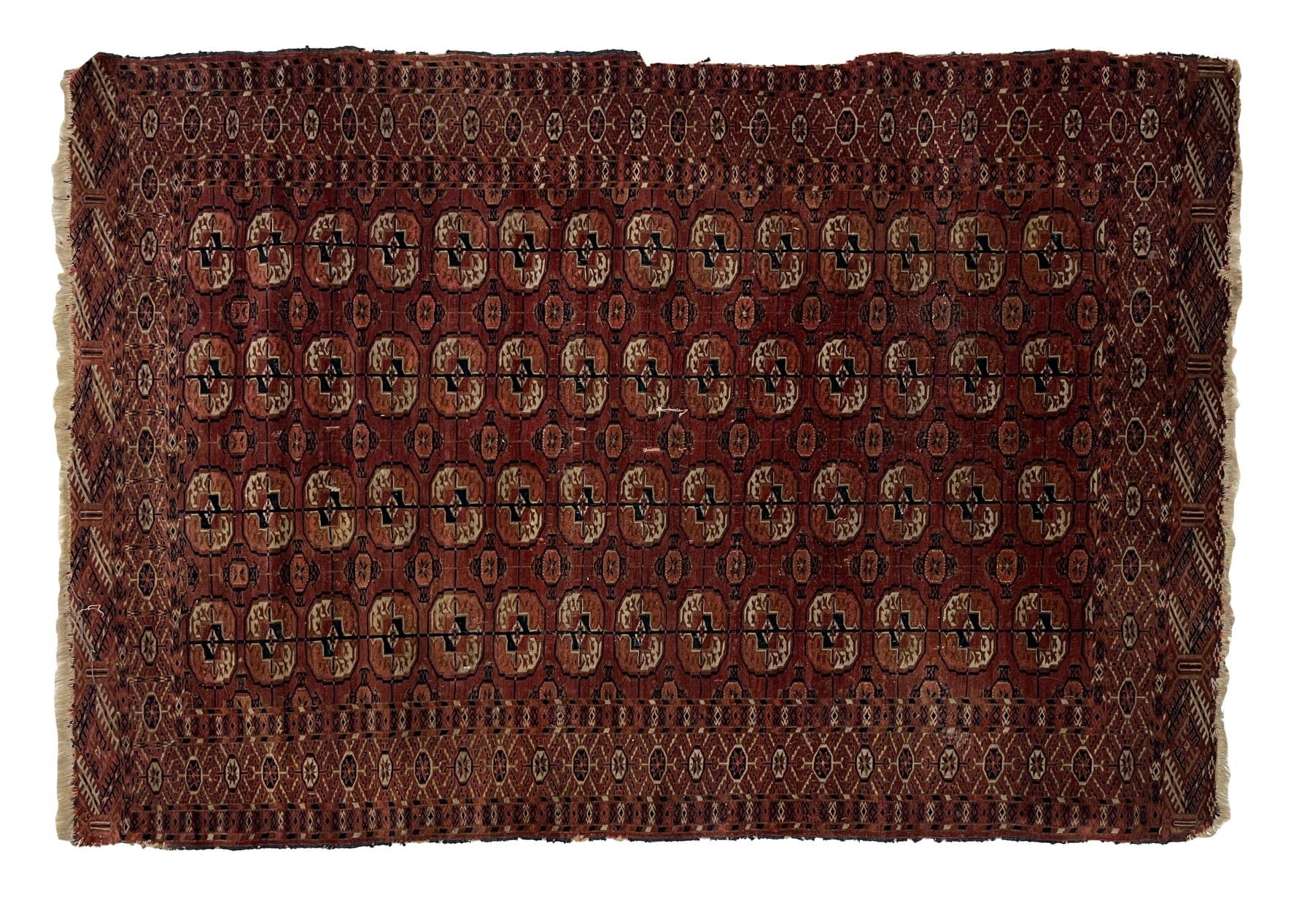 Alfombra Bukhara con decoración geométrica sobre fondo color bordeaux. 170 x 113 cm. Presenta averías y desgastes