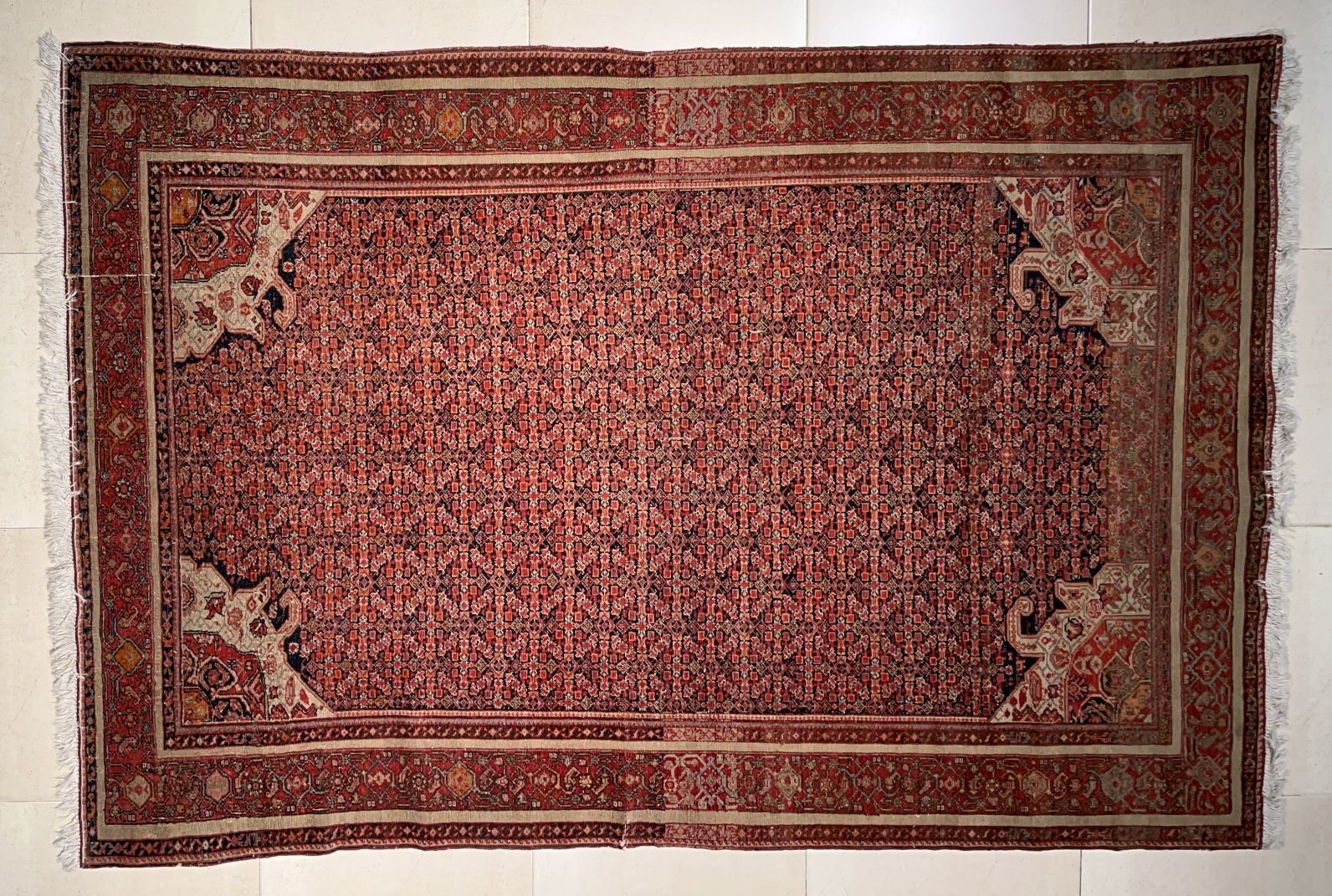 Alfombra caucásica con decoración geométrica en varios colores sobre fondo bordeaux y negro. 205 x 135 cm.