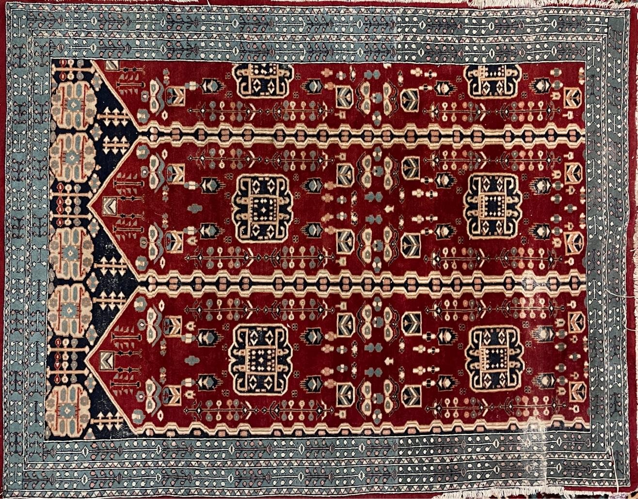 Alfombra caucásica con decoración geométrica en varios colores sobre fondo bordeaux, con guarda color gris. 160 x 125 cm. Presenta averías y desgastes.