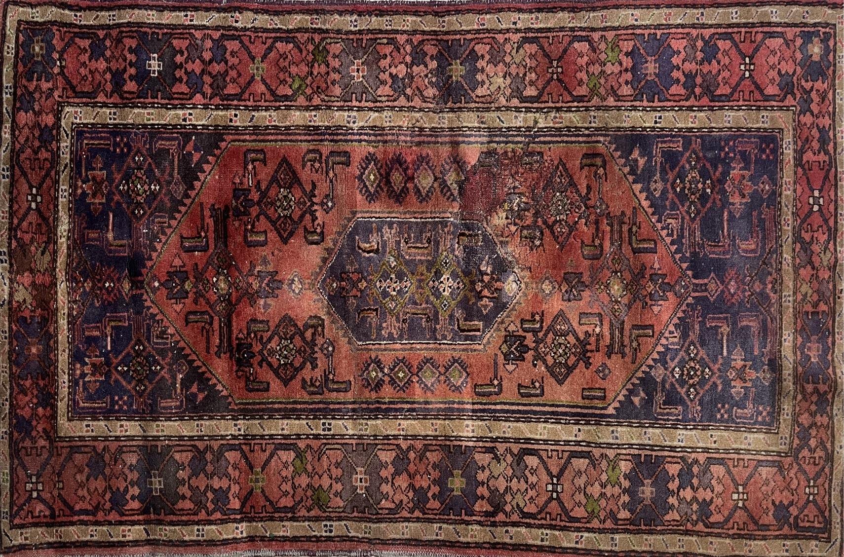 Alfombra caucásica con decoración geométrica floral sobre fondo bordeaux y azul. 190 x 126 cm. Presenta averías y desgastes.