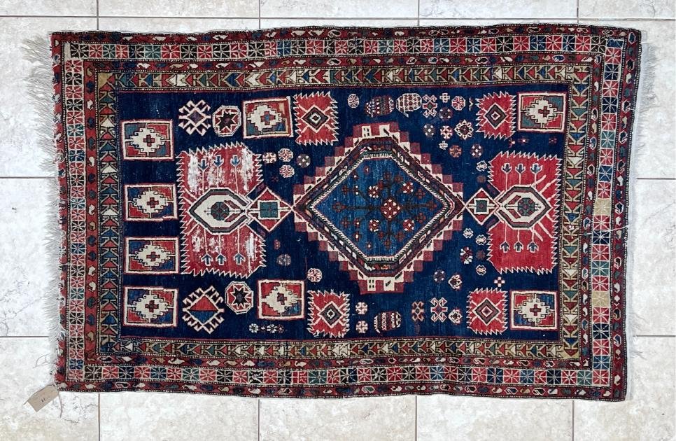 Alfombra caucásica con decoración geométrica en varios colores sobre fondo color azul, con desgastes. 160 x 102 cm.