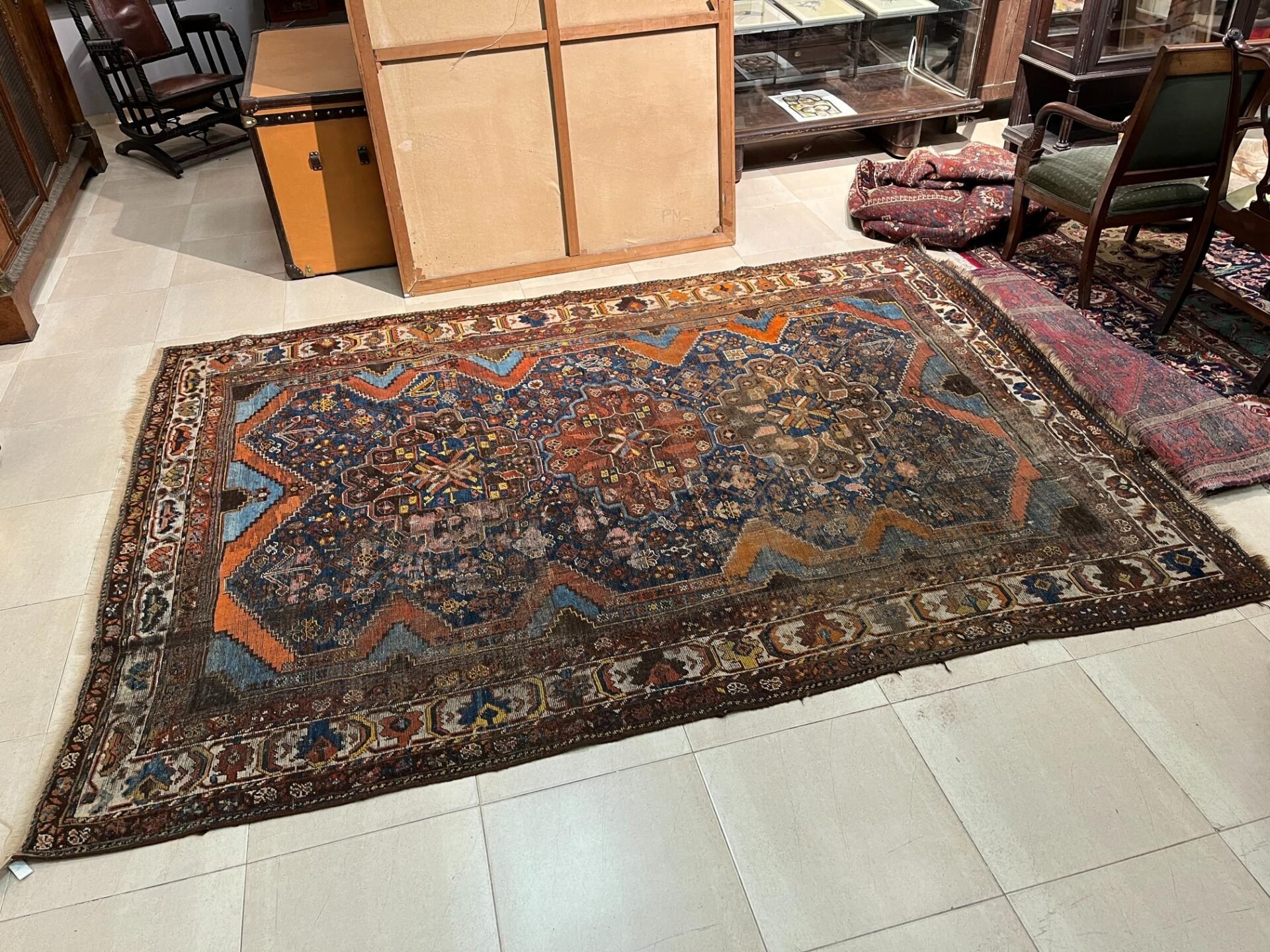 Alfombra caucásica con decoración geométrica en varios colores sobre fondo color azul. 300 x 216 cm