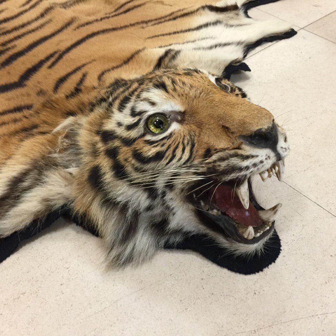 Alfombra de piel de tigre con cabeza taxidermada. 230 x 210 cm.