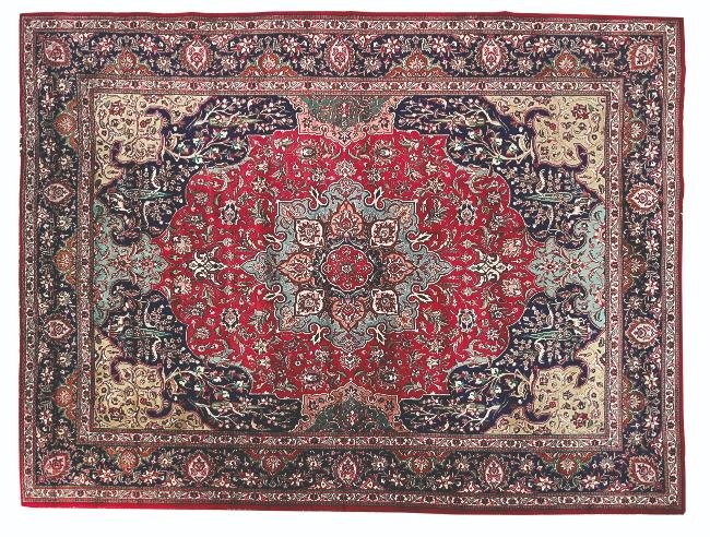 Alfombra persa con decoración floral y animal en varios colores sobre fondo color azul. 505 x 300 cm.
