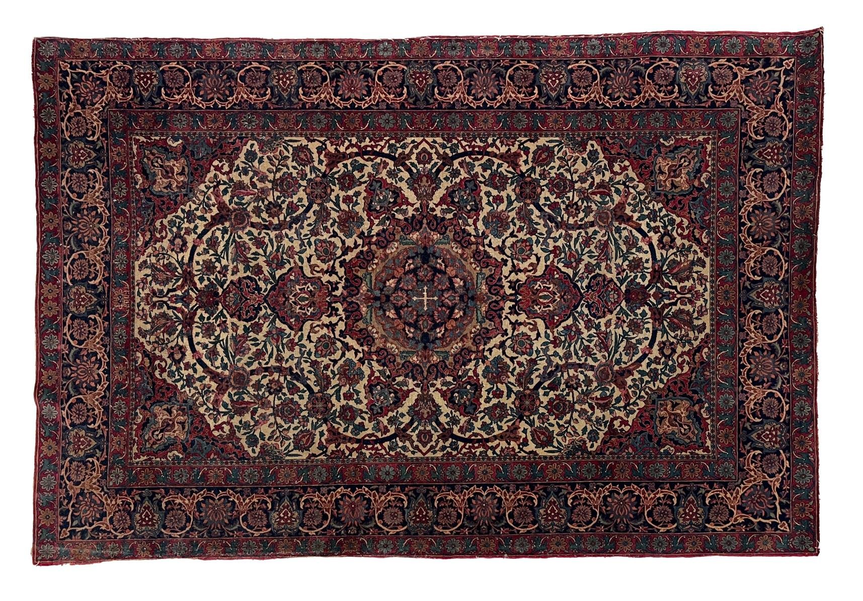 Alfombra persa con decoración floral en varios colores sobre fondo bordeaux con medallón central en color natural. 216 x 147 cm. Pequeña avería y faltante en flecos.