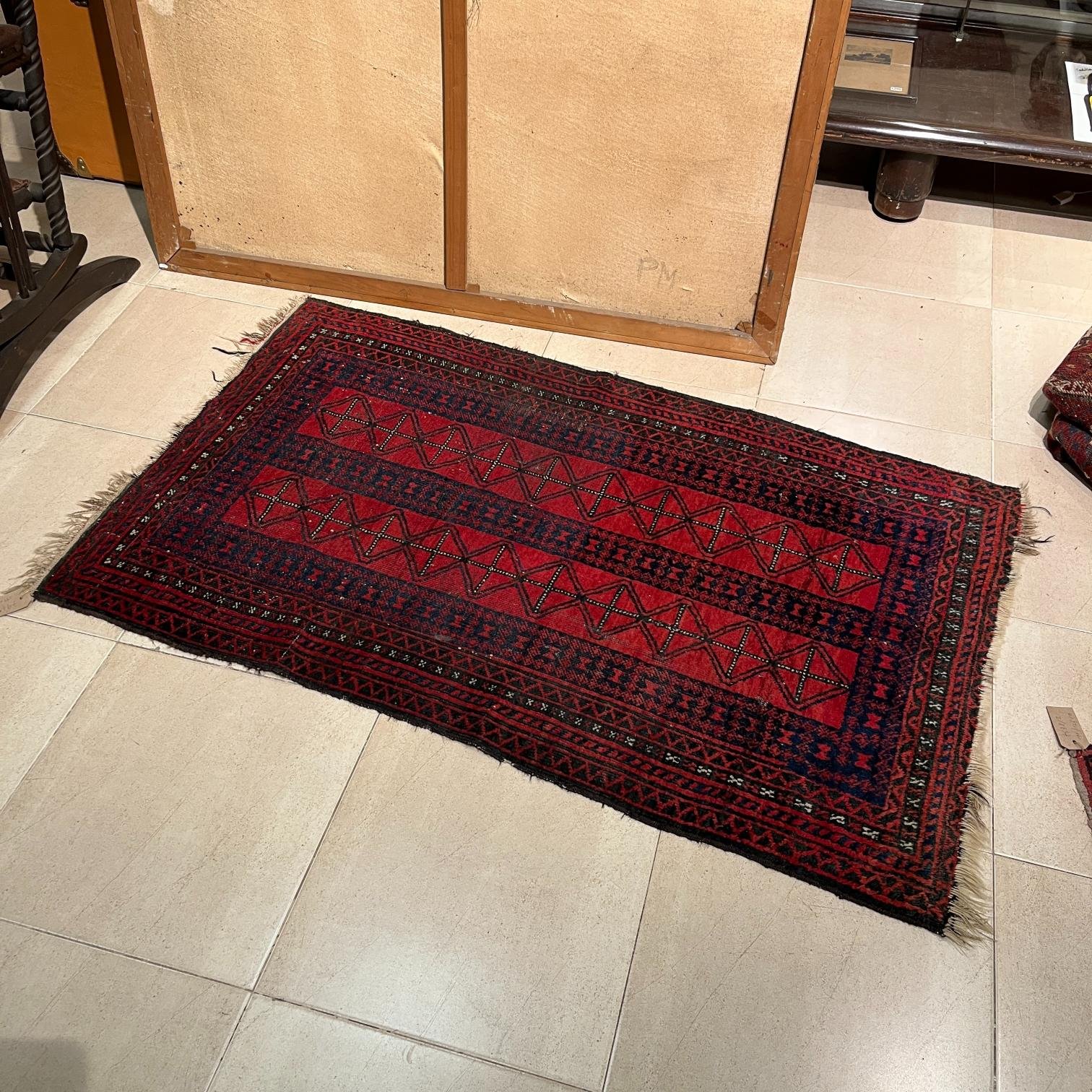 Alfombra persa con decoración geométrica sobre fondo color bordeaux, azul y negro. 155 x 92 cm.