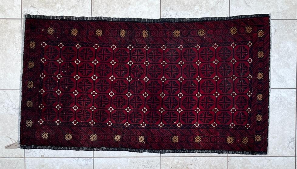 Alfombra persa con decoración geométrica en color blanco, amarillo y negro sobre fondo color bordeaux. 166 x 87 cm