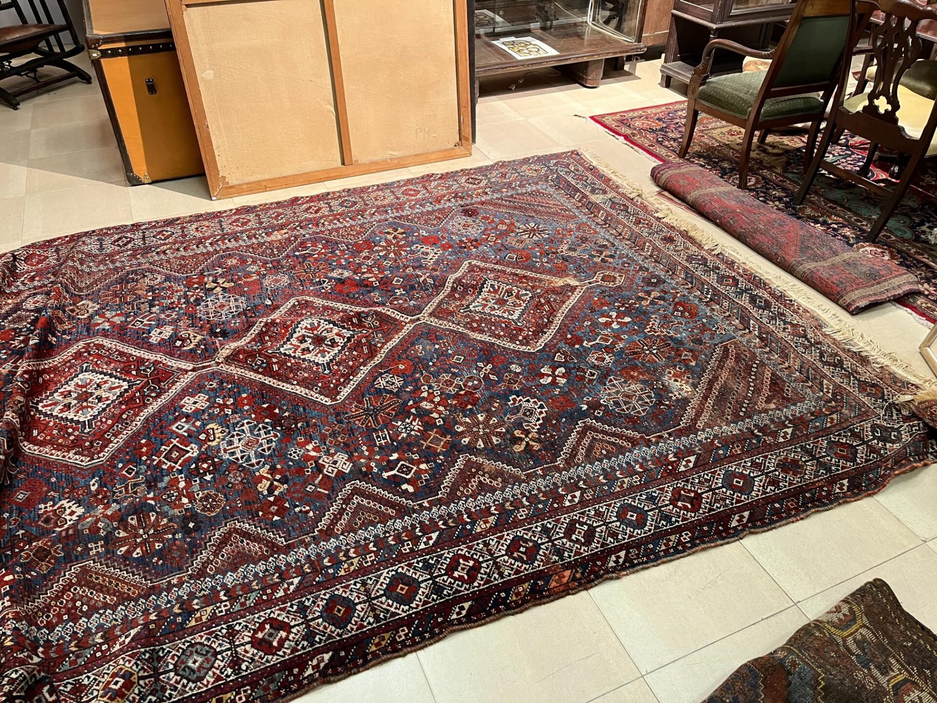 Alfombra Kashkai con decoración geométrica en varios colores sobre fondo color bordeaux. 440 x 247 cm.
