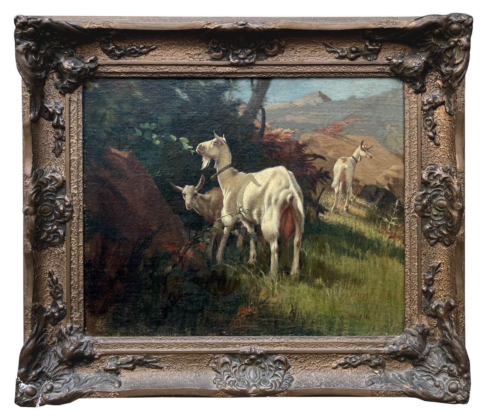 ALFREDO SORESSI (Escuela italiana, 1897-1982) Chivos en la montaña Óleo sobre madera Firmado abajo a la derecha 40 x 50 cm