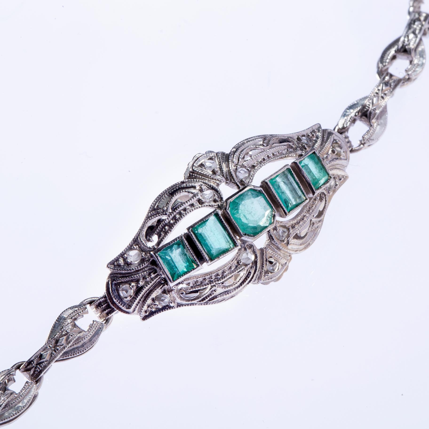 Pulsera en eslabones de oro 18 K blanco con cinco esmeraldas centrales rodeadas por quince diamantes. 180 x 17,5 mm. Peso bruto 17,6 gr.