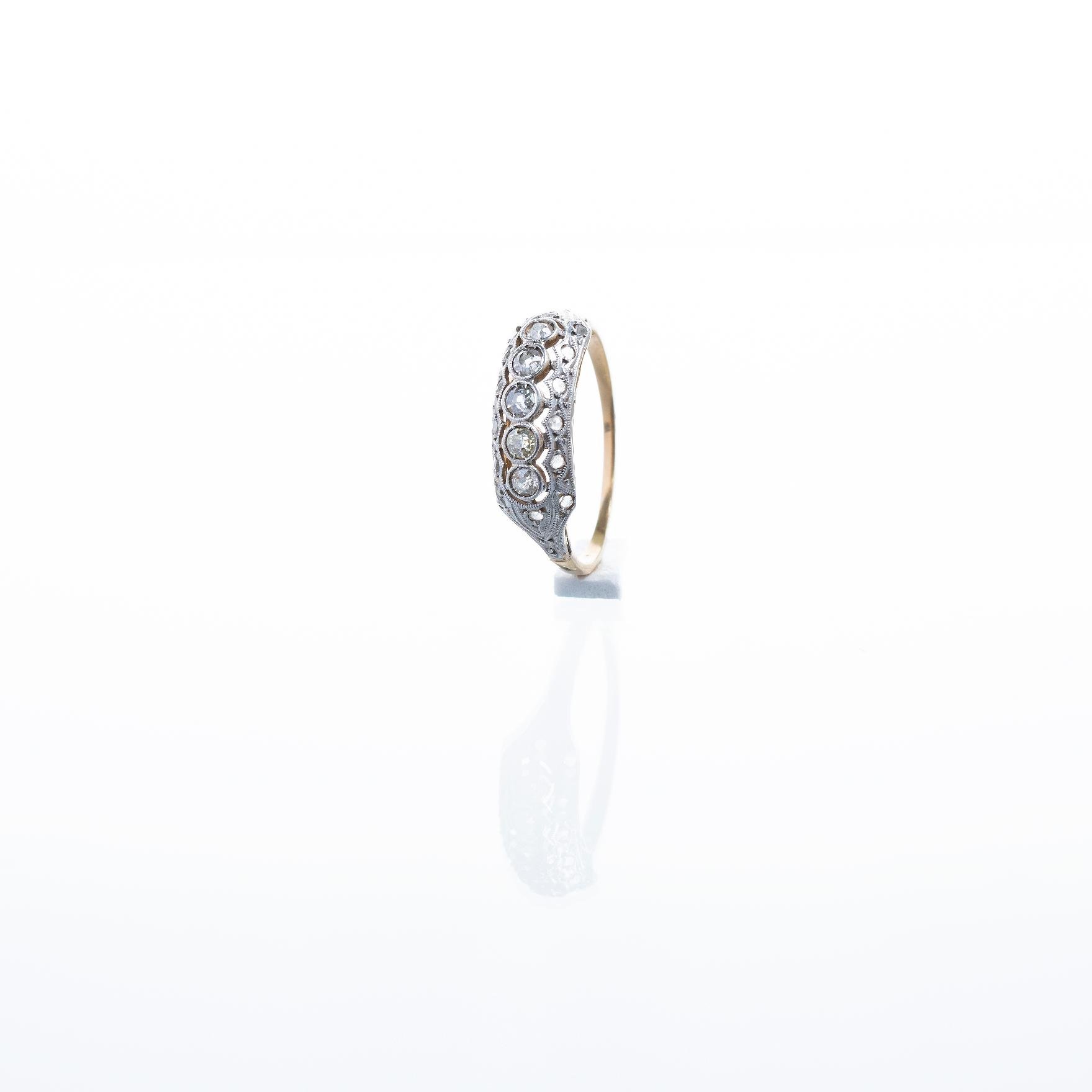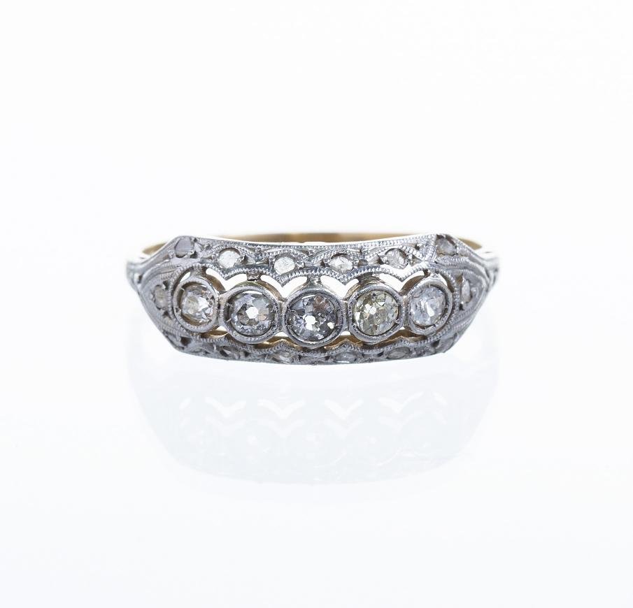 Anillo art decó en oro 18 K blanco y amarillo con cinco pequeños brillantes centrales y varios diamantes. Diámetro interno 19 mm. Peso bruto 2,3 gr.