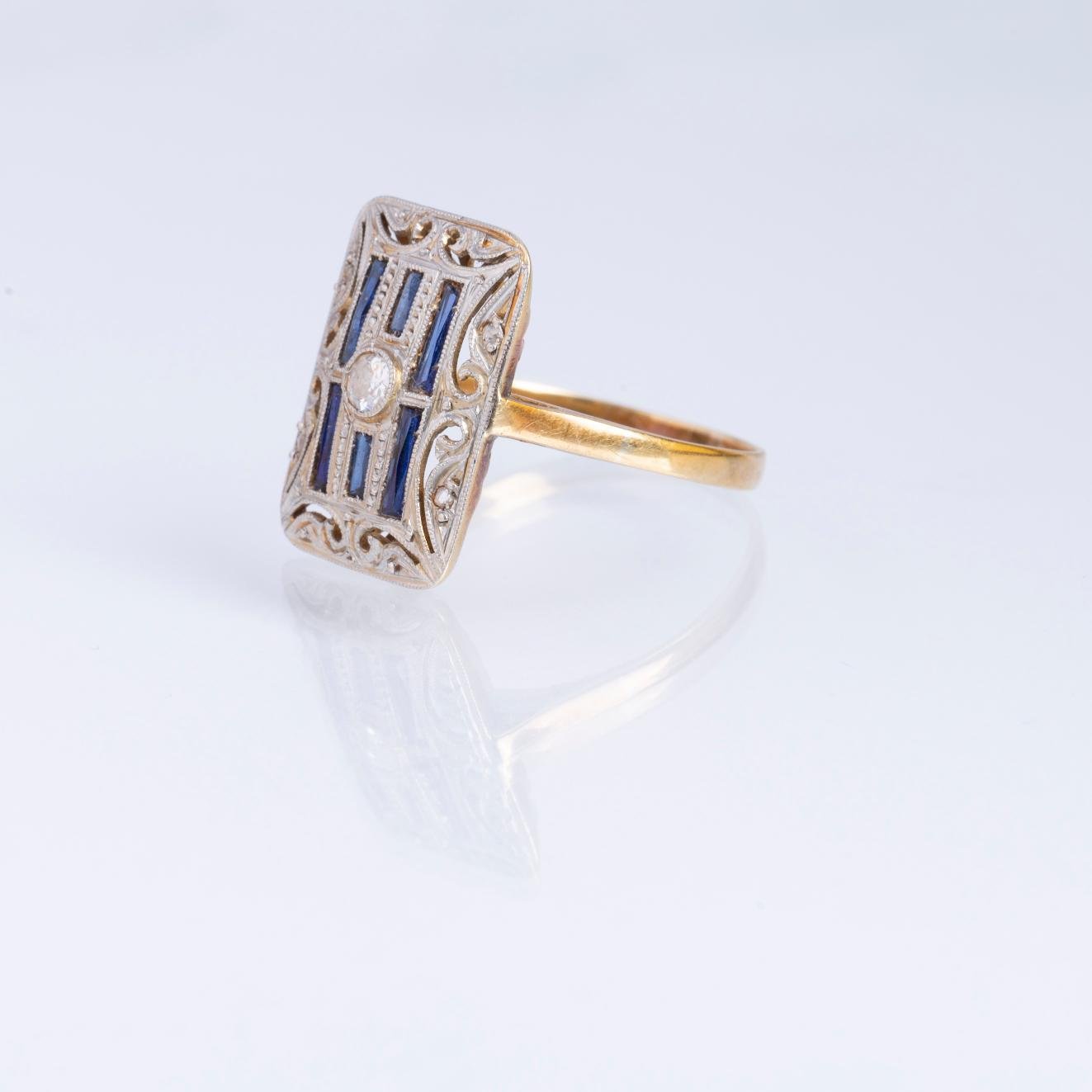 Anillo art decó oro 18 K blanco y amarillo, diamante y zafiros