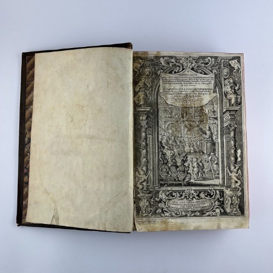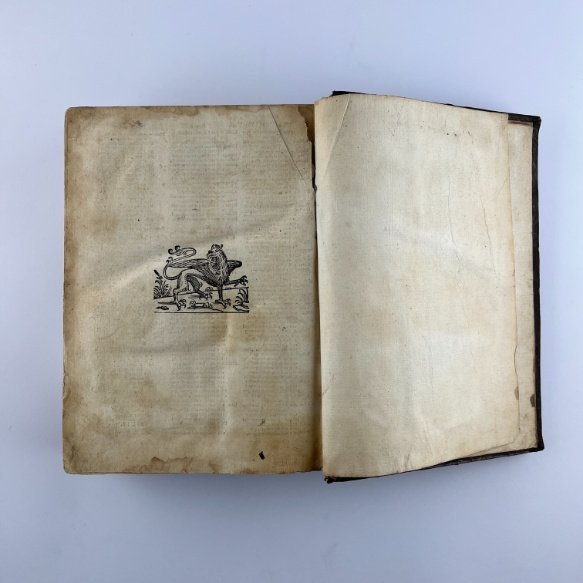 En 4° (21,5 x 15 cm), Portada (restaurada), 508 h., sin numerar, 1 h. Encuadernación en pleno cuero con una guarda dorada perimetral en las cubiertas; lomo con nervios, florones y títulos dorados, con algunas pérdidas. Ejemplar en líneas generales en buen estado -lleva antigua firma de propietario en la hoja de respeto-, con una vieja huella de agua que afecta parte del margen superior en la Portada y una docena de hojas. En la Portada y el colofón con sendas marcas del impresor, Giovanni Griffin, activo a mediados del siglo XVI.