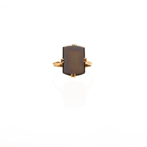 Anillo chevalier en oro 18 K amarillo con mesa central en ónix talla rectangular. Diámetro interno 17 mm. Peso bruto 3,3 gr.