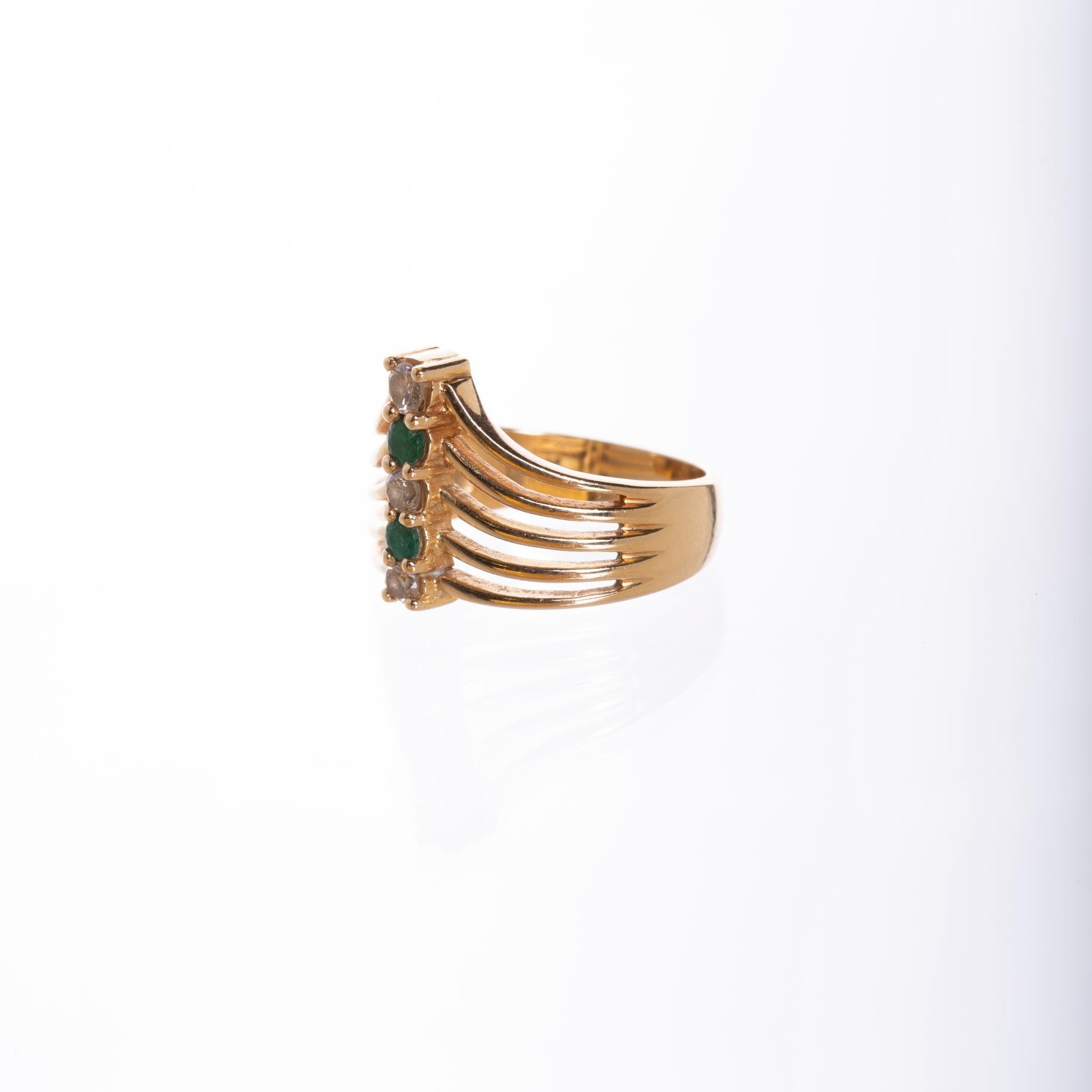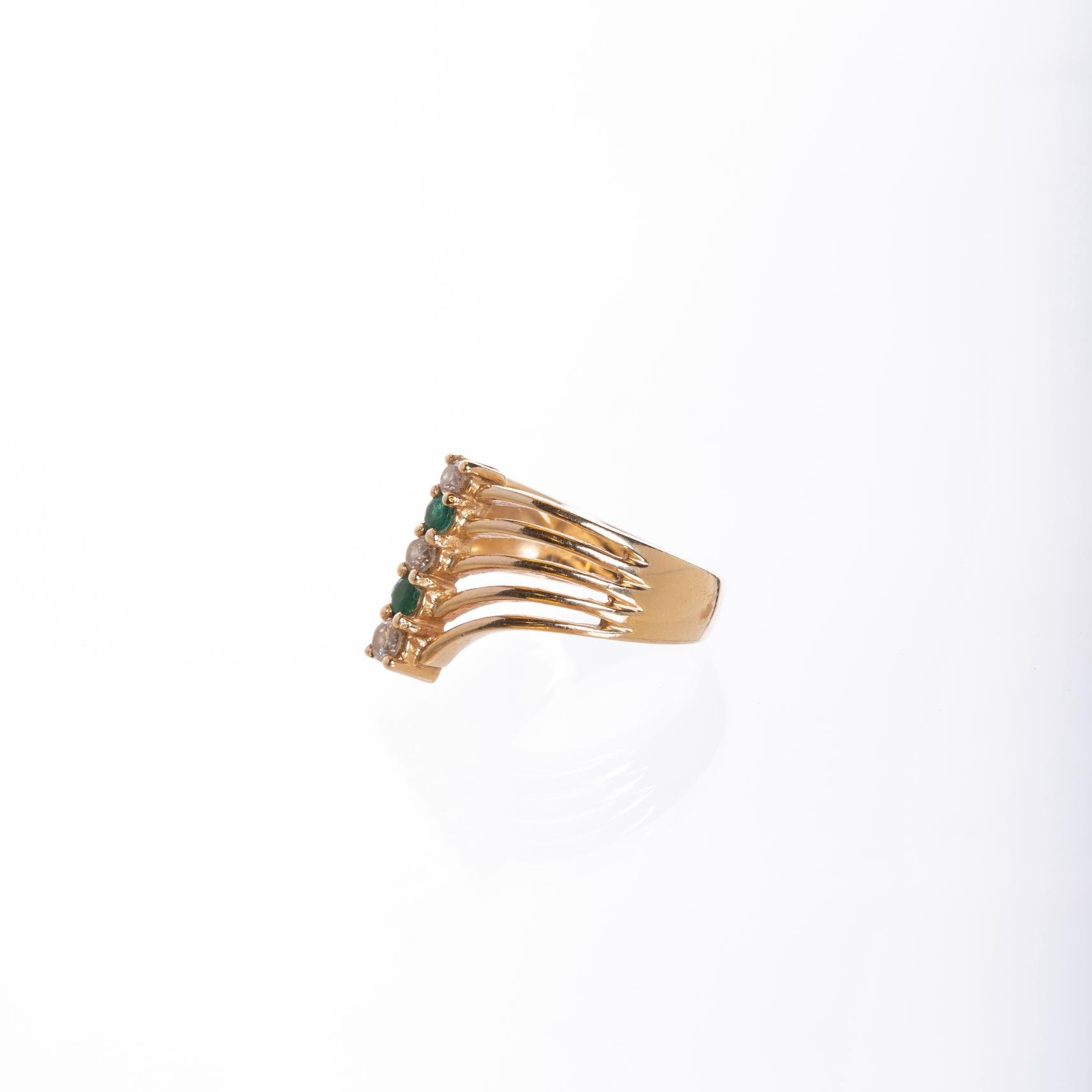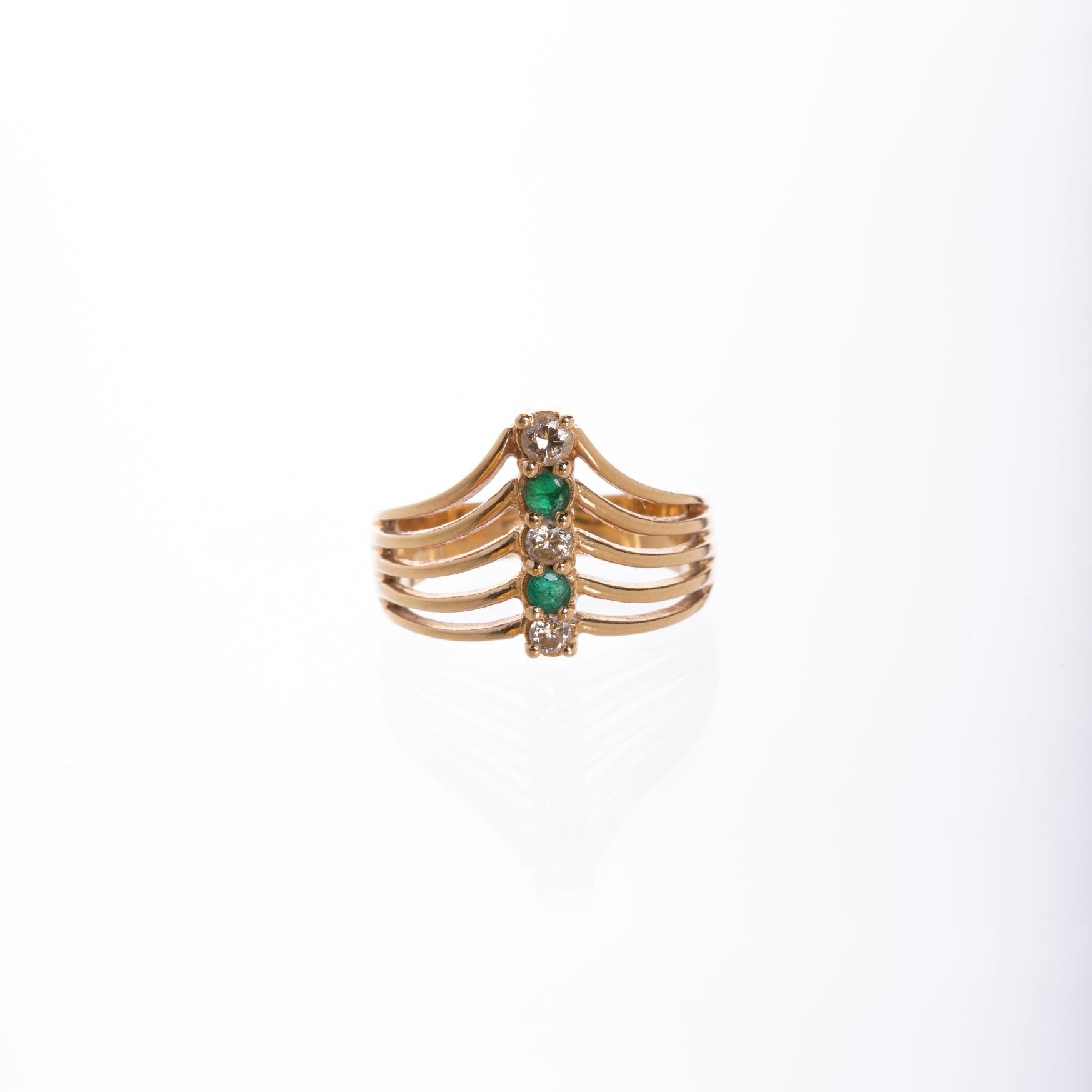 Anillo en oro 14 K amarillo con tres pequeños diamantes y dos esmeraldas. Diámetro interno 17 mm. Peso bruto 5,5 gr.