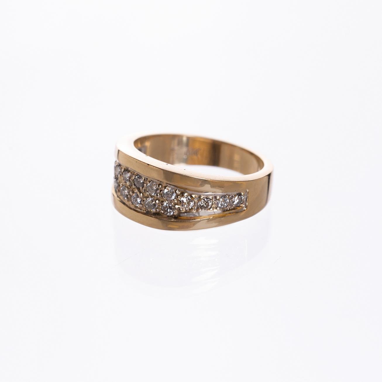 Anillo en oro 14 K amarillo con dieciocho pequeños diamantes talla brillante. Diámetro interno 17,5 mm. Peso bruto 7 gr.