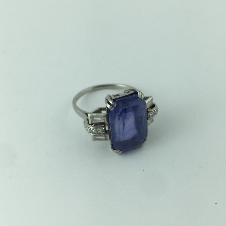 Anillo en oro 18 K blanco con piedra central color azul natural talla esmeralda (16 x 10 mm). Laterales con cuatro pequeños diamantes talla baguette y ocho pequeños brillantes. Peso bruto 8 gr.