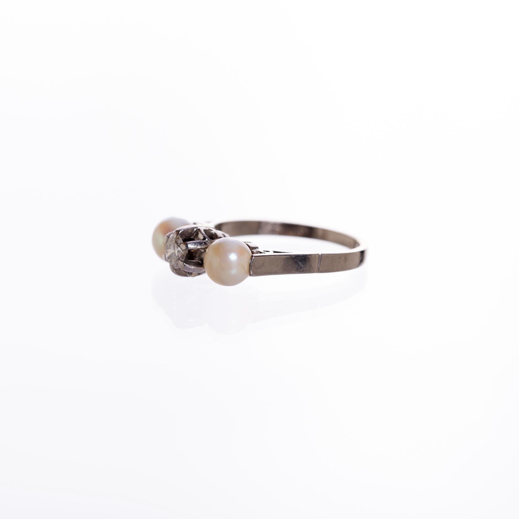 Anillo en oro 18 K blanco con un diamante central talla brillante de 0,25 ct aprox. y dos perlas de cultivo de un diámetro de 6 mm. Diámetro interno 17 mm. Peso bruto 4 gr.